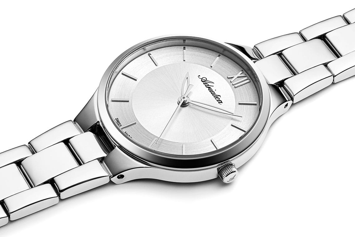 Женские кварцевые часы Adriatica A3823.5163Q — это элегантный аксессуар швейцарского производства с корпусом круглой формы из нержавеющей стали. Циферблат серебристого цвета выполнен по технологии Sunray с эффектом «солнечных лучей» и оформлен штрихами, а также римской цифрой 12. Защиту обеспечивает минеральное стеклоМинеральное стеклоМинеральное стекло представляет собой искусственно выращенный минерал кварца. Такое стекло отличается особой устойчивостью к повреждениям и царапинам. Уступает по некоторым качествам сапфировому стеклу.. Часы оснащены центральной секундной стрелкой. Браслет из нержавеющей стали фиксируется на раскладной застёжкеРаскладная застёжкаТакой тип застёжки используется только на браслетах из металла. Она никогда не раскрывается полностью, происходит разделение на 2 и более частей. Раскладывающая застёжка снизит вероятность потери часов к минимуму.. Механизм — кварцевый калибр Ronda 783. Водонепроницаемость 30 метров, позволит защитить корпус от случайных брызг или капель дождя.