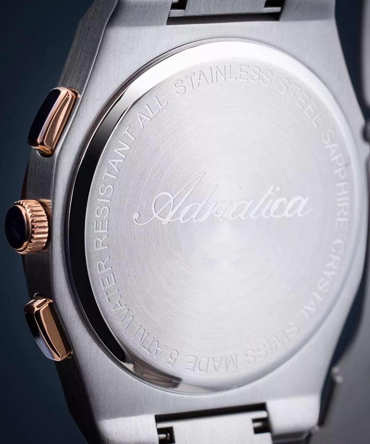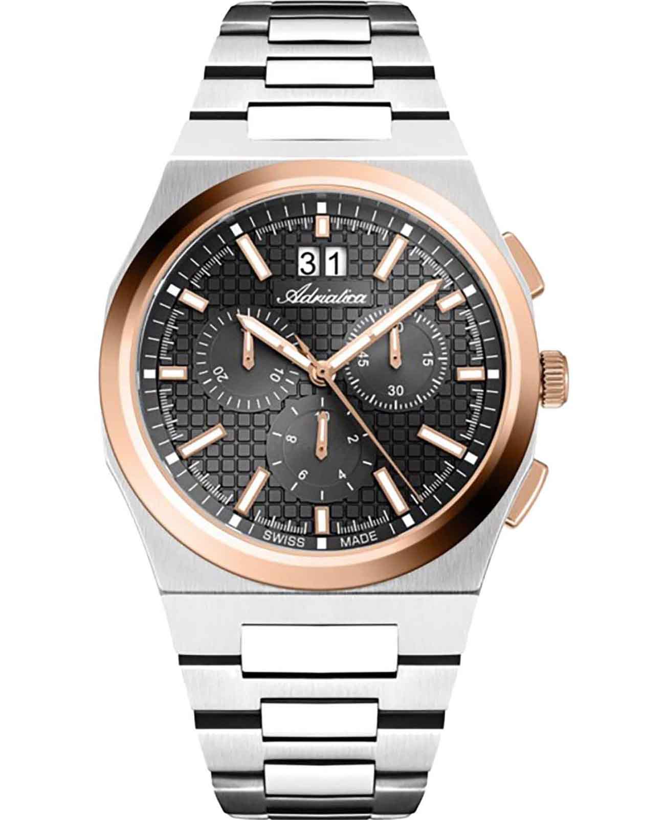 Мужские швейцарские часы-хронографХронографФункция позволяет измерять отрезки времени с особой точностью: часы, минуты, секунды. Верным признаком хронографа является наличие на циферблате 3 дополнительных окошек-счётчиков. с секундомеромСекундомерСекундоме́р — прибор, способный измерять интервалы времени с точностью до долей секунды. Adriatica Premiere A8326.R116CH воплощают в себе элегантность и функциональность, идеально подходящие для современных мужчин, ценящих швейцарское качество. Их черный циферблат защищенный сапфировым стекломСапфировое стеклоПрочный и надёжный материал из кристалла сапфира синтетического происхождения, характеризующийся особой твёрдостью и устойчивостью к царапинам и повреждениям., заключен в корпус из нержавеющей стали диаметром 40 мм и толщиной 10 мм, а на безельБезельВнешний ободок, закрепляющий стекло. В спортивных часах так называется поворотное кольцо с делениями на циферблате, выполняет роль таймера – замеряет отрезки времени на шкале. Неподвижный безель – элемент декора. Однонаправленно вращающийся безель на дайверских часах позволяет фиксировать моменты погружения и выныривания на поверхность. нанесено PVDPVDУльтратонкое покрытие наносится в технике вакуумного напыления, сочетает в себе нитрид титана особой прочности со слоем золота или оксида хрома. Несёт в себе декоративную или защитную функцию. покрытие. Надежный кварцевый механизм с калибром Ronda 5040.B обеспечивает высокую точность, а водозащита 5 ATM делает часы устойчивыми к воздействию воды. Стальной браслет с раскладной застёжкойРаскладная застёжкаТакой тип застёжки используется только на браслетах из металла. Она никогда не раскрывается полностью, происходит разделение на 2 и более частей. Раскладывающая застёжка снизит вероятность потери часов к минимуму. обеспечивает комфортное и надежное ношение. Фактурный циферблат с метками в виде штрихов дополнен рисунком в клетку, а окошко даты находится в положении 12 часов, что добавляет практичности в повседневной жизни. Люминесцентное покрытиеЛюминесцентное покрытиеПозволяет считывать показания времени в темноте. Производители наносят на стрелки, часовые индексы, безель или поверхность циферблата светонакопительный состав, дающий холодное свечение. на стрелках и метках обеспечивает отличную видимость в темноте.