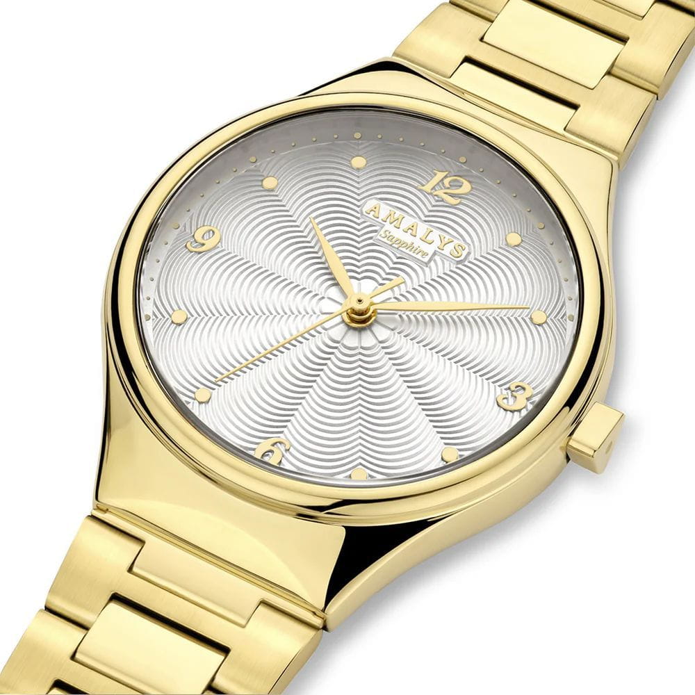 Amalys AMW-158 — женская модель с утончённым современным дизайном, в которой сочетаются минимализм и элегантность. Круглый корпус с PVD-покрытиемPVDУльтратонкое покрытие наносится в технике вакуумного напыления, сочетает в себе нитрид титана особой прочности со слоем золота или оксида хрома. Несёт в себе декоративную или защитную функцию. диаметром 31 мм гармонирует с браслетом с PVD-покрытиемPVDУльтратонкое покрытие наносится в технике вакуумного напыления, сочетает в себе нитрид титана особой прочности со слоем золота или оксида хрома. Несёт в себе декоративную или защитную функцию. шириной 16 мм, выполненным из нержавеющей стали и оснащённым раскладным замкомРаскладной замокДанный вариант застежки используется только на часах с металлическим браслетом. Отличительная особенность такого крепления в том, что длина браслета становится универсальной и вы можете самостоятельно отрегулировать нужный вам размер – застежка просто двигается по браслету часов., обеспечивающим удобство и надёжность при носке. Механизм — кварцевый, что гарантирует точный и стабильный ход. Защитную функцию выполняет сапфировое стеклоСапфировое стеклоПрочный и надёжный материал из кристалла сапфира синтетического происхождения, характеризующийся особой твёрдостью и устойчивостью к царапинам и повреждениям., стойкое к царапинам и сохраняющее прозрачность. Водозащита 5 ATM делает модель устойчивой к случайным брызгам и кратковременному контакту с водой. Лаконичный циферблат с декоративным узором и изящными стрелками подчёркивает изысканный характер часов, создавая универсальный образ, подходящий как для повседневных ситуаций, так и для особых случаев.