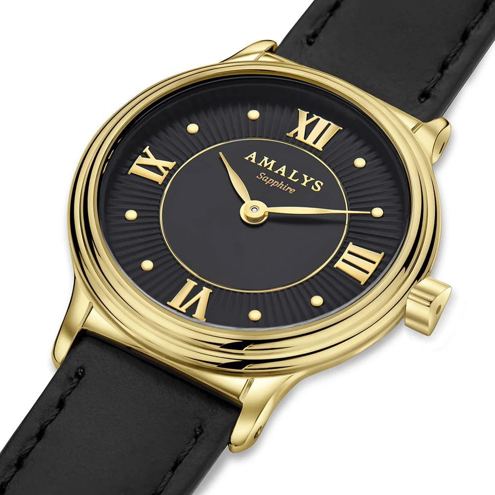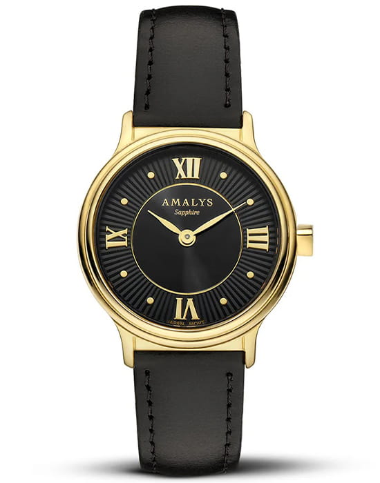 Amalys AMW-170 — женская модель с утончённым классическим дизайном, в которой сочетаются элегантность и практичность. Круглый корпус с PVD-покрытиемPVDУльтратонкое покрытие наносится в технике вакуумного напыления, сочетает в себе нитрид титана особой прочности со слоем золота или оксида хрома. Несёт в себе декоративную или защитную функцию. диаметром 28 мм выполнен из нержавеющей стали, гармонирующим с ремешком шириной 14 мм в том же исполнении. Защитную функцию выполняет сапфировое стеклоСапфировое стеклоПрочный и надёжный материал из кристалла сапфира синтетического происхождения, характеризующийся особой твёрдостью и устойчивостью к царапинам и повреждениям., стойкое к царапинам и сохраняющее прозрачность. Механизм — кварцевый, обеспечивающий точность и стабильность хода. Кожаный ремешок на стандартной застежке, который сочетает надёжность фиксации и удобство повседневного использования. Водозащита 5 ATM защищает часы от случайных брызг и дождя. Циферблат с римскими индексами и изящными стрелками подчёркивает классическую эстетику модели, делая её уместной как в повседневных образах, так и в торжественной обстановке.