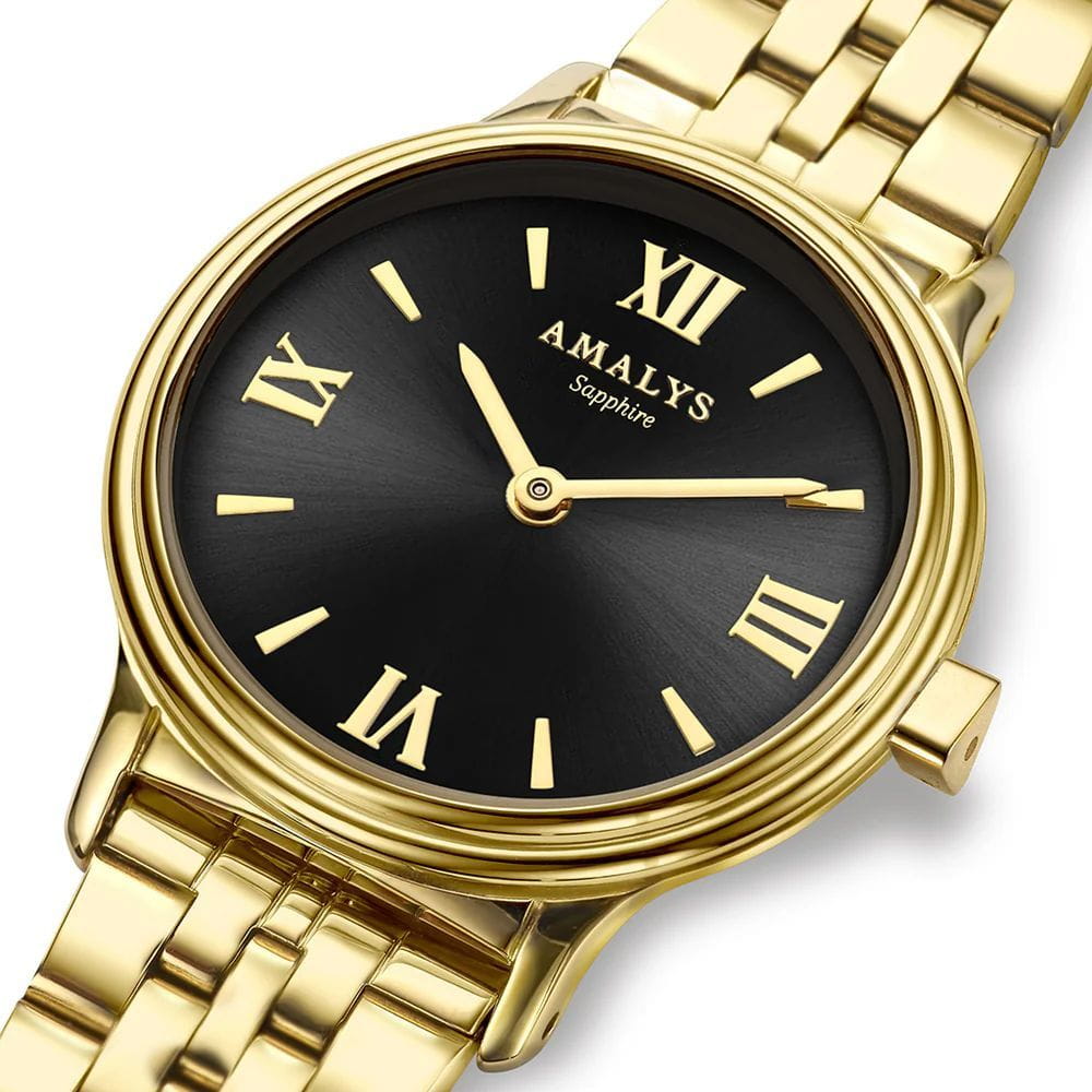 Amalys AMW-198 — женский набор, включающий часы и браслет, выполненный в гармоничном стиле. Круглый корпус диаметром 28 мм изготовлен из нержавеющей стали с PVDPVDУльтратонкое покрытие наносится в технике вакуумного напыления, сочетает в себе нитрид титана особой прочности со слоем золота или оксида хрома. Несёт в себе декоративную или защитную функцию.-покрытием тёплого золотистого оттенка, а браслет шириной 14 мм обеспечивает комфортное прилегание и подчёркивает изящный образ. Защитную функцию выполняет сапфировое стеклоСапфировое стеклоПрочный и надёжный материал из кристалла сапфира синтетического происхождения, характеризующийся особой твёрдостью и устойчивостью к царапинам и повреждениям., устойчивое к царапинам и сохраняющее прозрачность. Механизм — кварцевый, надёжный и точный. Браслет с PVDPVDУльтратонкое покрытие наносится в технике вакуумного напыления, сочетает в себе нитрид титана особой прочности со слоем золота или оксида хрома. Несёт в себе декоративную или защитную функцию.-покрытием снабжён раскладным замкомРаскладной замокДанный вариант застежки используется только на часах с металлическим браслетом. Отличительная особенность такого крепления в том, что длина браслета становится универсальной и вы можете самостоятельно отрегулировать нужный вам размер – застежка просто двигается по браслету часов., что делает ношение удобным и безопасным. Водозащита 5 ATM предохраняет модель от случайных брызг и дождя. Циферблат с римскими индексами и утончённым декоративным узором придаёт часам элегантность, а комплектный браслет завершает цельный и женственный образ.