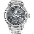 Aviator Douglas MoonFlight V.1.33.0.254.5 — элегантный дамский швейцарский Moonphase-хронограф с утончённой авиационной эстетикой. Корпус 36 мм из нержавеющей стали 316L обладает компактными пропорциями и удобным литым профилем. Циферблат в стиле Art Deco украшает усложнение фаз Луны в верхней половине, обрамлённой тонким кольцом облаков. Отмечено окно даты в положении «6 часов». Стрелки обработаны люминесцентным покрытиемЛюминесцентное покрытиеПозволяет считывать показания времени в темноте. Производители наносят на стрелки, часовые индексы, безель или поверхность циферблата светонакопительный состав, дающий холодное свечение. Superluminova — для уверенного считывания в темноте. Поверхность защищена сапфировым стекломСапфировое стеклоПрочный и надёжный материал из кристалла сапфира синтетического происхождения, характеризующийся особой твёрдостью и устойчивостью к царапинам и повреждениям. с антибликовым покрытиемАнтибликовое покрытиеСлой оксида металла в 0,13-0,3 микрон, благодаря которому стекло часов не бликует и не отражает свет. Антибликовое покрытие уменьшает отражение света в 10 раз, обеспечивая отличную читаемость показателей циферблата.. Сердце модели — швейцарский кварцевый механизм Ronda 708 с функцией отображения лунных фаз, 13 рубинами и возможностью работать до 54 месяцев без замены батареи. Завинчивающаяся задняя крышка с гравировкой Douglas DC-3 и герметичность до 100 метров создают надёжную основу для эксплуатации. Стальной браслет миланского плетения на раскладном замкеРаскладной замокДанный вариант застежки используется только на часах с металлическим браслетом. Отличительная особенность такого крепления в том, что длина браслета становится универсальной и вы можете самостоятельно отрегулировать нужный вам размер – застежка просто двигается по браслету часов., сочетая комфорт, элегантность и практичность. Лимитированная серия. Aviator Douglas MoonFlight — это гармоничное сочетание авиационного наследия, женской элегантности и технической изысканности, воплощённое в элегантном и функциональном аксессуаре.