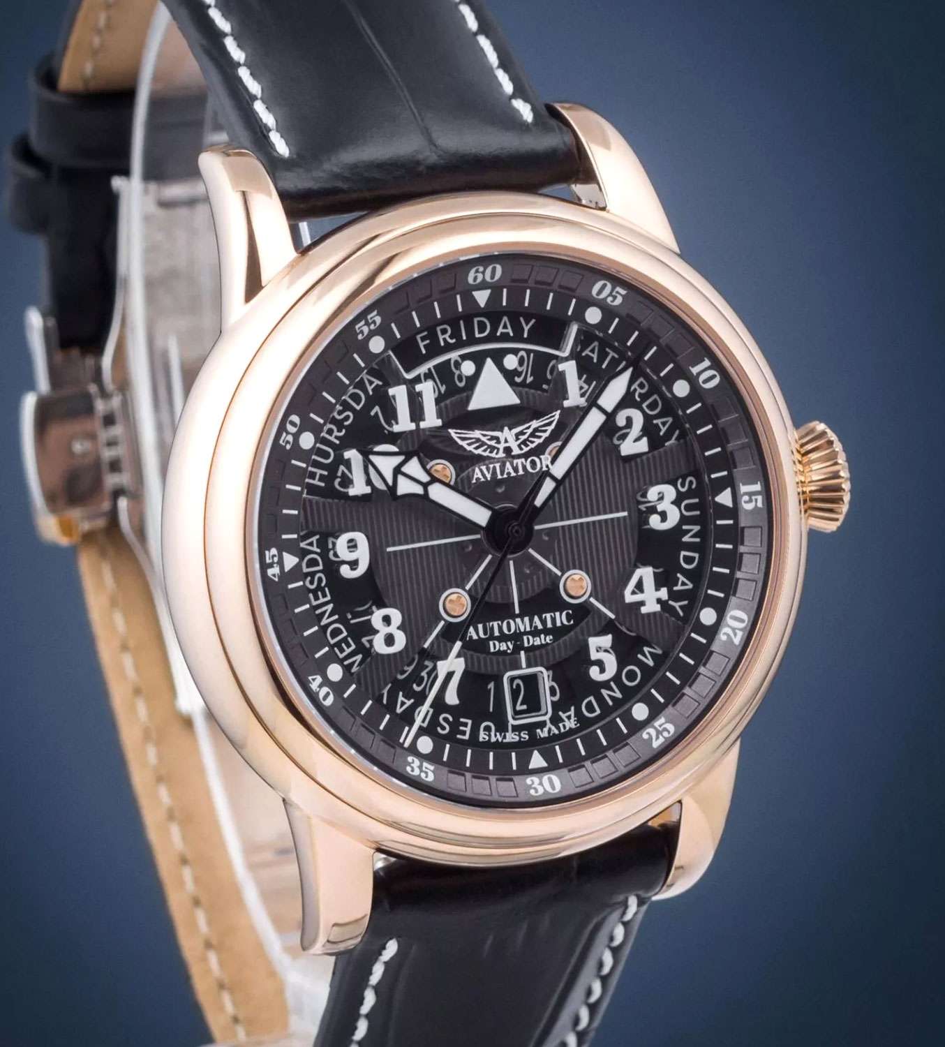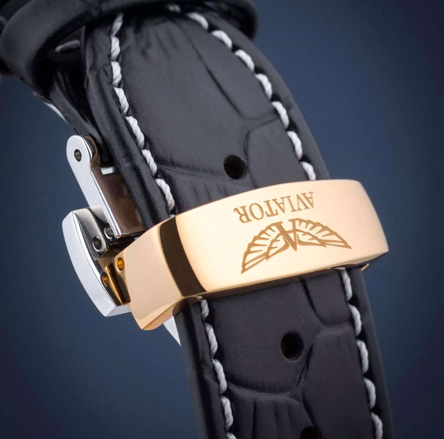 Aviator Douglas Day Date V.3.36.2.285.4 — швейцарские часы в классике авиадизайна, сочетающие безупречную читаемость и высокую надёжность. Лимитированная серия. Корпус диаметром 41 мм выполнен из нержавеющей стали 316L с PVD-покрытиемPVDУльтратонкое покрытие наносится в технике вакуумного напыления, сочетает в себе нитрид титана особой прочности со слоем золота или оксида хрома. Несёт в себе декоративную или защитную функцию. цвета розового золота. Накладные метки выполнены в виде арабских цифр. Окошко даты находится в положении 6 часов. День недели находится в положении 12 часов. Часовые метки и стрелки покрыты люминесцентным покрытиемЛюминесцентное покрытиеПозволяет считывать показания времени в темноте. Производители наносят на стрелки, часовые индексы, безель или поверхность циферблата светонакопительный состав, дающий холодное свечение. Superluminova, позволяющим легко определять время даже в тёмное время суток. Поверхность защищена прочным сапфировым стекломСапфировое стеклоПрочный и надёжный материал из кристалла сапфира синтетического происхождения, характеризующийся особой твёрдостью и устойчивостью к царапинам и повреждениям. с антибликовым покрытием, устойчивым к царапинам. Сердце модели — швейцарский механизм Sellita SW 240-2, известный своей точностью и долговечностью. Водозащита 100 метров, позволит плавать, нырять и заниматься другими водными видами спорта. Завинчивающаяся головка и задняя крышка обеспечивают уверенную ударопрочностьУдаропрочный корпусМеханизм заключён в корпус, выполненный из современных материалов, устойчивых к ударам, механическим повреждениям и падению с высоты: инновационный пластик, карбон, нержавеющая сталь, титан. и надёжную защиту от влаги и пыли. В механизме 26 камней, запас хода до 41 час. Модель дополнена кожаным ремешком с выразительной текстурой и классическим стилем, закреплённым с помощью застёжке-бабочке с кнопкамиЗастёжка "бабочка"Такой вид застёжки дополняется предохранителями, помогающими избежать случайного раскрытия браслета. Обладают изящным исполнением. — для максимального комфорта и лёгкости в повседневном использовании. Ротор механизма с заклепанными элементами и вырезанными окнами напоминает фюзеляж самолета. Aviator — это образец лётной точности, инженерной чёткости и сдержанной роскоши, идеально подходящий для тех, кто ценит функциональность и уверенность в каждом элементе.