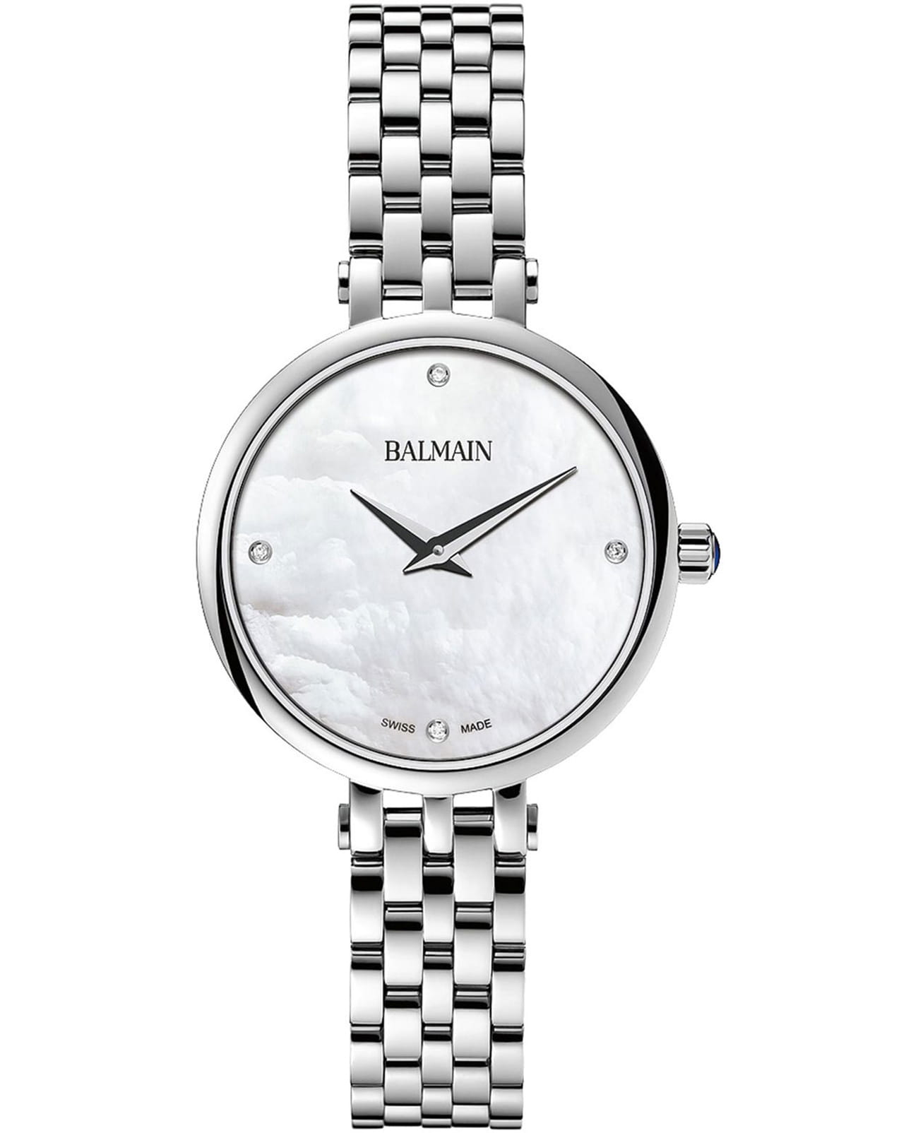 Женские часы Balmain Sedirea B4291.33.85 кварцевый механизм с высокой точностью. Сапфировое стеклоСапфировое стеклоПрочный и надёжный материал из кристалла сапфира синтетического происхождения, характеризующийся особой твёрдостью и устойчивостью к царапинам и повреждениям. устойчивое к появлению царапин, обладающее высокой прозрачностью. Корпус изготовлен из нержавеющей стали. Класс водозащиты: 50 метров, позволит защитить корпус от случайных брызг или капель дождя. Стальной браслет на застёжке «бабочка» с кнопкамиЗастёжка "бабочка"Такой вид застёжки дополняется предохранителями, помогающими избежать случайного раскрытия браслета. Обладают изящным исполнением. .