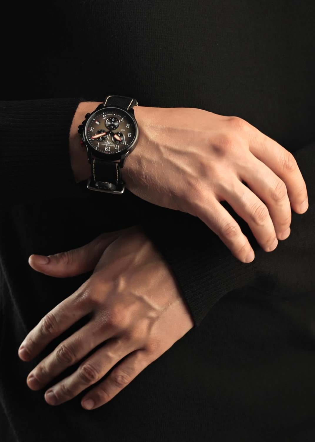 Мужские кварцевые часы-хронограф Bauhaus — это функциональный аксессуар в стиле авиационных приборов. Корпус диаметром 42 мм и толщиной 12 мм выполнен из стали с IP-покрытиемIP-покрытиеМетод ионного напыления. Демонстрирует повышенную устойчивость к истиранию, окислению и химическим веществам. Под воздействием высокого давления и температуры около 1500°C молекулы металла надёжно соединяются с частицами корпуса часов. и комбинированной матовой, полированной отделкой. Циферблат коричневого цвета с градиентным переходом и зернистой фактурой оформлен арабскими цифрами и мечевидными стрелками в стиле Sword. Присутствуют три субциферблата хронографа. Окошко даты расположено в положении 4 часов, также присутствует индикация второго часового пояса в 24-часовом формате. Стрелки и метки с люминесцентным покрытиемЛюминесцентное покрытиеПозволяет считывать показания времени в темноте. Производители наносят на стрелки, часовые индексы, безель или поверхность циферблата светонакопительный состав, дающий холодное свечение., обеспечивающим хорошую читаемость в темноте. Циферблат защищён прочным минеральным стекломМинеральное стеклоМинеральное стекло представляет собой искусственно выращенный минерал кварца. Такое стекло отличается особой устойчивостью к повреждениям и царапинам. Уступает по некоторым качествам сапфировому стеклу. K1. Механизм — швейцарский кварцевый с функциями хронографаХронографФункция позволяет измерять отрезки времени с особой точностью: часы, минуты, секунды. Верным признаком хронографа является наличие на циферблате 3 дополнительных окошек-счётчиков. и секундомераСекундомерСекундоме́р — прибор, способный измерять интервалы времени с точностью до долей секунды.. Рифлёная заводная головка с защитой обеспечивает надёжную настройку времени. Часы оснащены кожаным ремешком с декоративной белой строчкой и классической пряжкой. Водонепроницаемость 100 м позволяет использовать часы для плавания и повседневного ношения. Идеальный выбор для тех, кто ценит немецкое качество и спортивный дизайн.