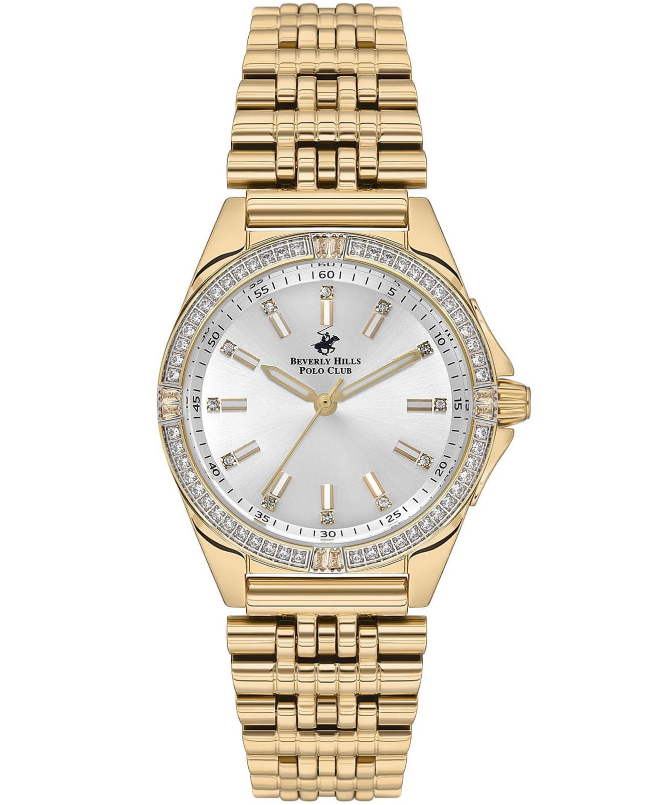 Женские наручные часы Beverly Hills Polo Club BP3587C.120 с надёжным автоматическим механизмом. Минеральное стеклоМинеральное стеклоМинеральное стекло представляет собой искусственно выращенный минерал кварца. Такое стекло отличается особой устойчивостью к повреждениям и царапинам. Уступает по некоторым качествам сапфировому стеклу. устойчивое к мелким механическим повреждениям. Корпус часов изготовлен из суперметалла с IP-покрытиемIP-покрытиеМетод ионного напыления. Демонстрирует повышенную устойчивость к истиранию, окислению и химическим веществам. Под воздействием высокого давления и температуры около 1500°C молекулы металла надёжно соединяются с частицами корпуса часов.. Стальной браслет на раскладной застёжкеРаскладная застёжкаТакой тип застёжки используется только на браслетах из металла. Она никогда не раскрывается полностью, происходит разделение на 2 и более частей. Раскладывающая застёжка снизит вероятность потери часов к минимуму.. Класс водозащиты: 50 метров, позволит защитить корпус от случайных брызг или капель дождя. БезельБезельВнешний ободок, закрепляющий стекло. В спортивных часах так называется поворотное кольцо с делениями на циферблате, выполняет роль таймера – замеряет отрезки времени на шкале. Неподвижный безель – элемент декора. Однонаправленно вращающийся безель на дайверских часах позволяет фиксировать моменты погружения и выныривания на поверхность. и циферблат инкрустированы кристаллами циркония.