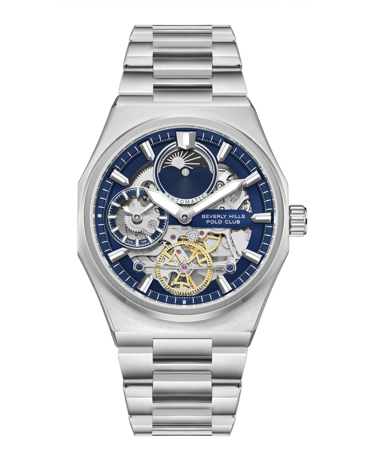 Мужские часы Beverly Hills Polo Club BP3786X.390 — это стильный аксессуар, выполненный из стали с Сапфировое стеклоСапфировое стеклоПрочный и надёжный материал из кристалла сапфира синтетического происхождения, характеризующийся особой твёрдостью и устойчивостью к царапинам и повреждениям., что делает их устойчивыми к царапинам и обеспечивающими чёткое восприятие информации при любом освещении. Модель оснащена автоматическим механизмом с автоподзаводом и функцией скелетон, что позволяет наблюдать за работой механизма через прозрачное окошко. Циферблат синего цвета дополнен штриховыми метками, а его дизайн подчёркивает внимание к деталям и элегантность. Стальной браслет обеспечивает надёжную фиксацию на запястье и гармонично сочетается с корпусом. Водонепроницаемость позволяет использовать часы в повседневных условиях — при мытье рук или под лёгким дождём. Гарантия 2 года подтверждает качество и надёжность изделия. Эти часы станут универсальным аксессуаром для тех, кто ценит сочетание стиля, функциональности и качества — идеальный выбор для повседневной носки и деловых встреч.