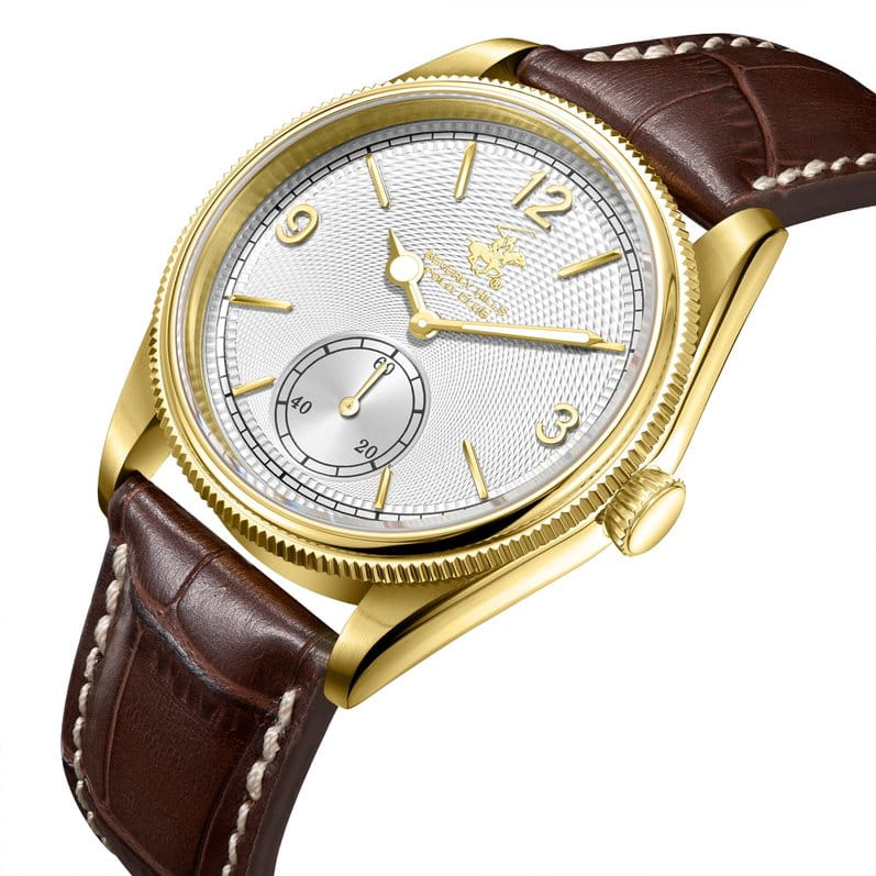 BEVERLY HILLS POLO CLUB BP3807X.132 — стильные мужские часы, сочетающие спортивную динамику и функциональность. Крупный корпус выполнен из нержавеющей стали с IP-покрытиемIP-покрытиеМетод ионного напыления. Демонстрирует повышенную устойчивость к истиранию, окислению и химическим веществам. Под воздействием высокого давления и температуры около 1500°C молекулы металла надёжно соединяются с частицами корпуса часов. золотистого цвета, диаметром 39 мм, гармонично дополнен кожаным ремешком на застёжке-бабочке с кнопкамиЗастёжка "бабочка"Такой вид застёжки дополняется предохранителями, помогающими избежать случайного раскрытия браслета. Обладают изящным исполнением. . Рифленый неподвижный безельБезельВнешний ободок, закрепляющий стекло. В спортивных часах так называется поворотное кольцо с делениями на циферблате, выполняет роль таймера – замеряет отрезки времени на шкале. Неподвижный безель – элемент декора. Однонаправленно вращающийся безель на дайверских часах позволяет фиксировать моменты погружения и выныривания на поверхность.. Циферблат с акцентными стрелками с люминесцентным покрытиемЛюминесцентное покрытиеПозволяет считывать показания времени в темноте. Производители наносят на стрелки, часовые индексы, безель или поверхность циферблата светонакопительный состав, дающий холодное свечение. делает модель более практичной. Минеральное стеклоМинеральное стеклоМинеральное стекло представляет собой искусственно выращенный минерал кварца. Такое стекло отличается особой устойчивостью к повреждениям и царапинам. Уступает по некоторым качествам сапфировому стеклу. с сапфировым покрытием защищает циферблат от царапин, а кварцевый механизм обеспечивает высокую точность. Благодаря своей универсальной эстетике эти часы уместны и в деловой среде, и в повседневном образе. Идеальный выбор для тех, кто ценит элегантный дизайн и качество. Водозащита до 50 метров позволит защитить корпус от случайных брызг или капель дождя.