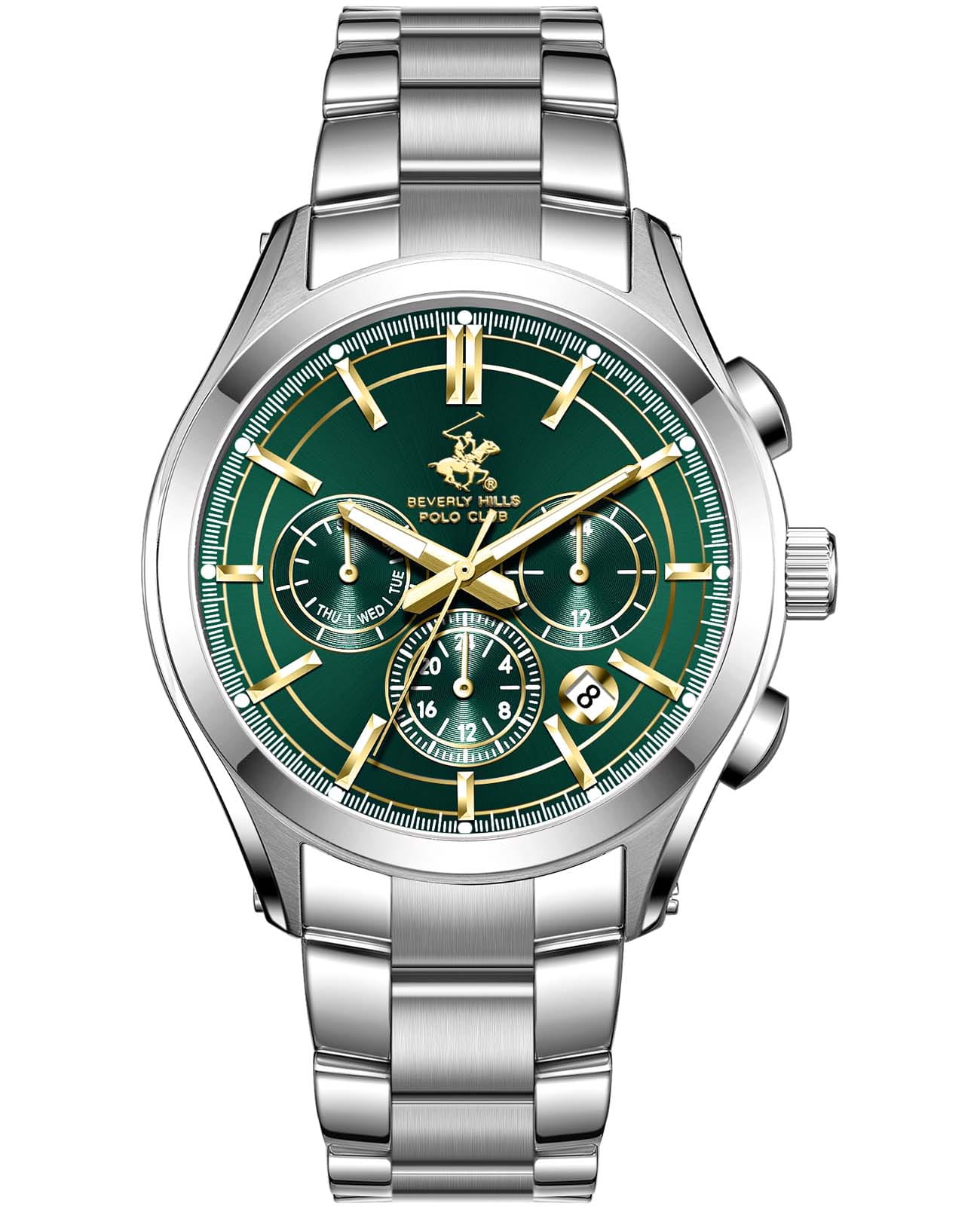 BEVERLY HILLS POLO CLUB BP3812X.370 — стильные мужские часы, сочетающие спортивную динамику и функциональность. Крупный корпус выполнен из нержавеющей стали серебристого цвета, диаметром 42 мм, гармонично дополнен стальным браслетом на застёжке-бабочке с кнопкамиЗастёжка "бабочка"Такой вид застёжки дополняется предохранителями, помогающими избежать случайного раскрытия браслета. Обладают изящным исполнением. . Циферблат с акцентными метками и стрелками с люминесцентным покрытиемЛюминесцентное покрытиеПозволяет считывать показания времени в темноте. Производители наносят на стрелки, часовые индексы, безель или поверхность циферблата светонакопительный состав, дающий холодное свечение. делает модель более практичной. Минеральное стеклоМинеральное стеклоМинеральное стекло представляет собой искусственно выращенный минерал кварца. Такое стекло отличается особой устойчивостью к повреждениям и царапинам. Уступает по некоторым качествам сапфировому стеклу. с сапфировым покрытием защищает циферблат от царапин, а кварцевый механизм обеспечивает высокую точность. Окошко даты находится в положении между 4 и 5 часов. Благодаря своей универсальной эстетике эти часы уместны и в деловой среде, и в повседневном образе. Идеальный выбор для тех, кто ценит элегантный дизайн и качество. Водозащита до 50 метров позволит защитить корпус от случайных брызг или капель дождя.