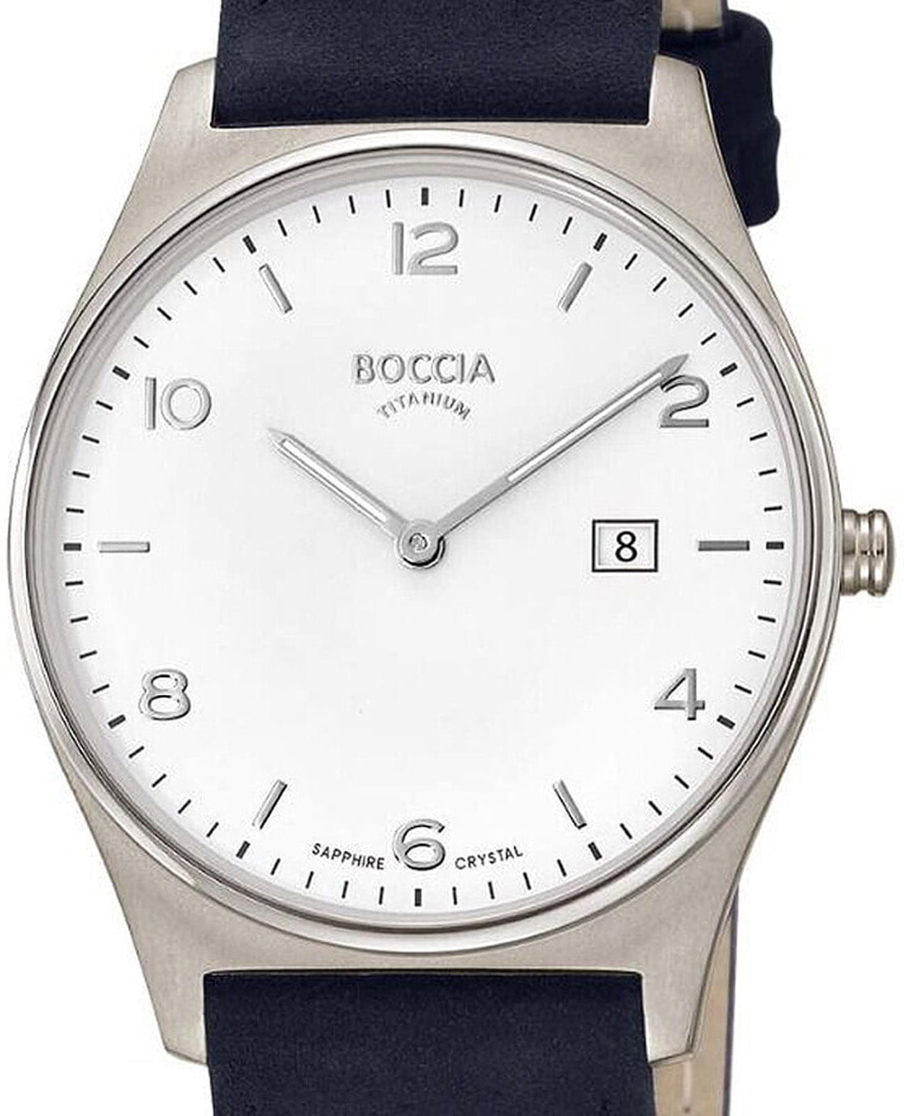 Мужские немецкие титановые часы Boccia Titanium 3655-01, кварцевый механизм с высокой точностью. Сапфировое стеклоСапфировое стеклоПрочный и надёжный материал из кристалла сапфира синтетического происхождения, характеризующийся особой твёрдостью и устойчивостью к царапинам и повреждениям. устойчивое к появлению царапин, обладающее высокой прозрачностью. Корпус изготовлен из титана. Класс водозащиты: 50 метров, позволит защитить корпус от случайных брызг или капель дождя. Кожаный ремешок на стандартной застёжке. Стрелки и метки с люминесцентным покрытиемЛюминесцентное покрытиеПозволяет считывать показания времени в темноте. Производители наносят на стрелки, часовые индексы, безель или поверхность циферблата светонакопительный состав, дающий холодное свечение..