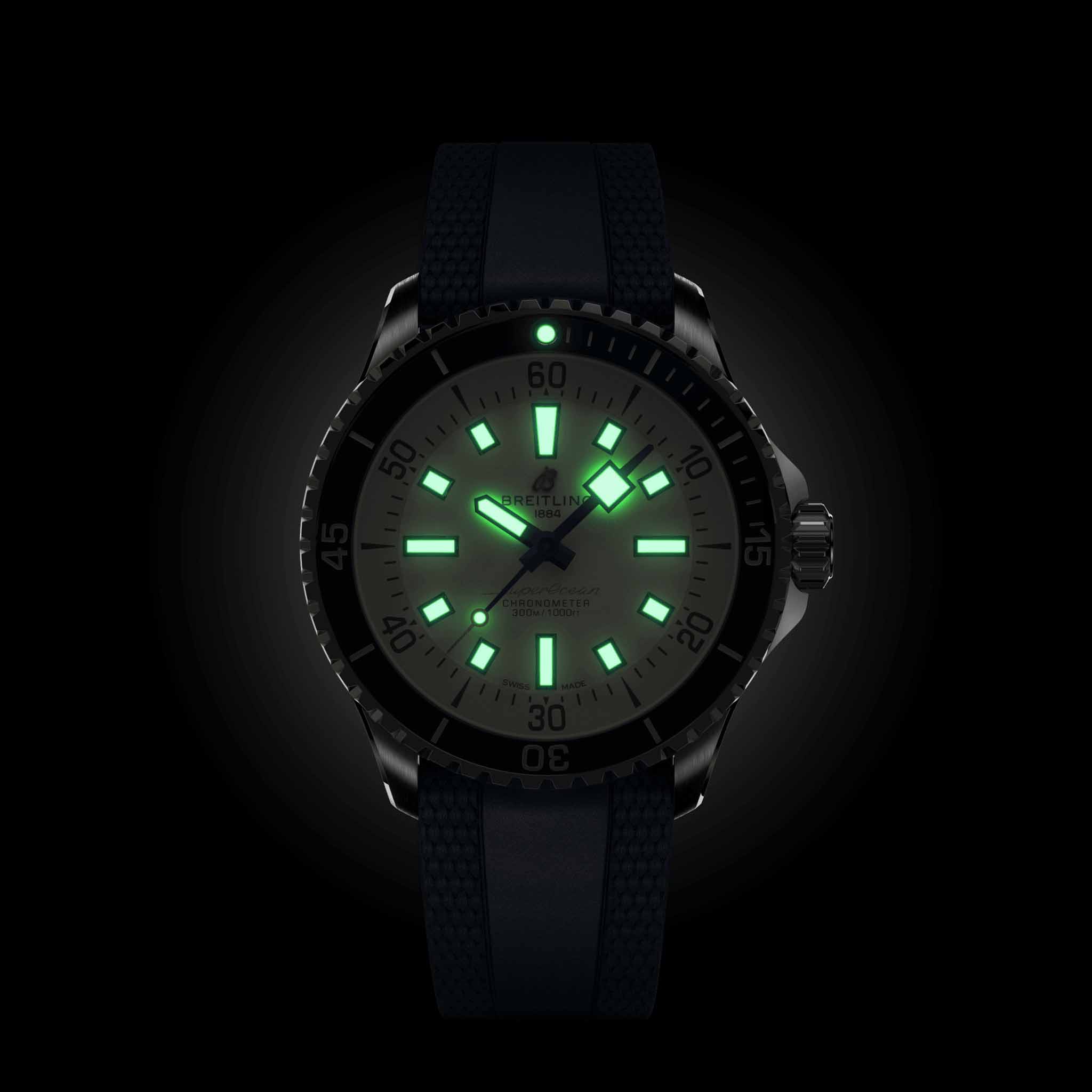 Мужские водонепроницаемые швейцарские часы Breitling Superocean Automatic 42 A17375E71G1S1, механический механизм (автоматический калибр) с высокой точностью. Сапфировое стеклоСапфировое стеклоПрочный и надёжный материал из кристалла сапфира синтетического происхождения, характеризующийся особой твёрдостью и устойчивостью к царапинам и повреждениям. устойчивое к появлению царапин, обладающее высокой прозрачностью. Класс водозащиты: 300 метров, позволит плавать, нырять и заниматься другими водными видами спорта. Корпус часов изготовлен из стали. Силиконовый ремешок с раскладной застёжкойРаскладная застёжкаТакой тип застёжки используется только на браслетах из металла. Она никогда не раскрывается полностью, происходит разделение на 2 и более частей. Раскладывающая застёжка снизит вероятность потери часов к минимуму.. Стрелки и метки с люминесцентным покрытиемЛюминесцентное покрытиеПозволяет считывать показания времени в темноте. Производители наносят на стрелки, часовые индексы, безель или поверхность циферблата светонакопительный состав, дающий холодное свечение.. Широкие стрелки и индексы с люминесцентным покрытиемЛюминесцентное покрытиеПозволяет считывать показания времени в темноте. Производители наносят на стрелки, часовые индексы, безель или поверхность циферблата светонакопительный состав, дающий холодное свечение. обеспечивают легкую читаемость под водой. Вращающийся стальной безельБезельВнешний ободок, закрепляющий стекло. В спортивных часах так называется поворотное кольцо с делениями на циферблате, выполняет роль таймера – замеряет отрезки времени на шкале. Неподвижный безель – элемент декора. Однонаправленно вращающийся безель на дайверских часах позволяет фиксировать моменты погружения и выныривания на поверхность. с люминесцентным покрытиемЛюминесцентное покрытиеПозволяет считывать показания времени в темноте. Производители наносят на стрелки, часовые индексы, безель или поверхность циферблата светонакопительный состав, дающий холодное свечение. Superluminova из нержавеющей стали и керамики, защищенный от царапин, никогда не изнашивается и не выцветает.