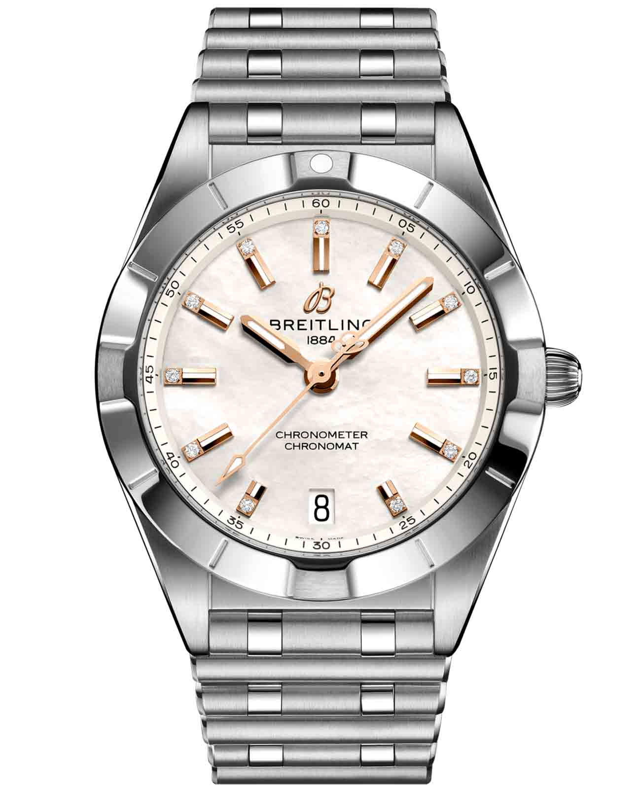 Женские швейцарские кварцевые часы Breitling Chronomat 32 A77310101A4A1, механический механизм (автоматический калибр) с высокой точностью. Сапфировое стеклоСапфировое стеклоПрочный и надёжный материал из кристалла сапфира синтетического происхождения, характеризующийся особой твёрдостью и устойчивостью к царапинам и повреждениям. с антибликовым покрытием устойчивое к появлению царапин, обладающее высокой прозрачностью. Класс водозащиты: 100 метров, позволит плавать, нырять и заниматься другими водными видами спорта. Корпус часов изготовлен из стали. Стальной браслет с застёжкой-бабочкой с кнопкамиЗастёжка "бабочка"Такой вид застёжки дополняется предохранителями, помогающими избежать случайного раскрытия браслета. Обладают изящным исполнением. . Окошко даты находится в положении 6 часов. Часы имеют сертификат COSCСертификат COSCОфициальный сертификат, подтверждающий то, что часы ходят с особо высокой точностью. Для получения документа часы подвергаются тестовым испытаниям, разработанным швейцарским институтом тестирования хронометров COSC. Допустимая норма для механических часов -4/+6 секунд в день, для кварцевых моделей +/- 0,07 секунд в день..