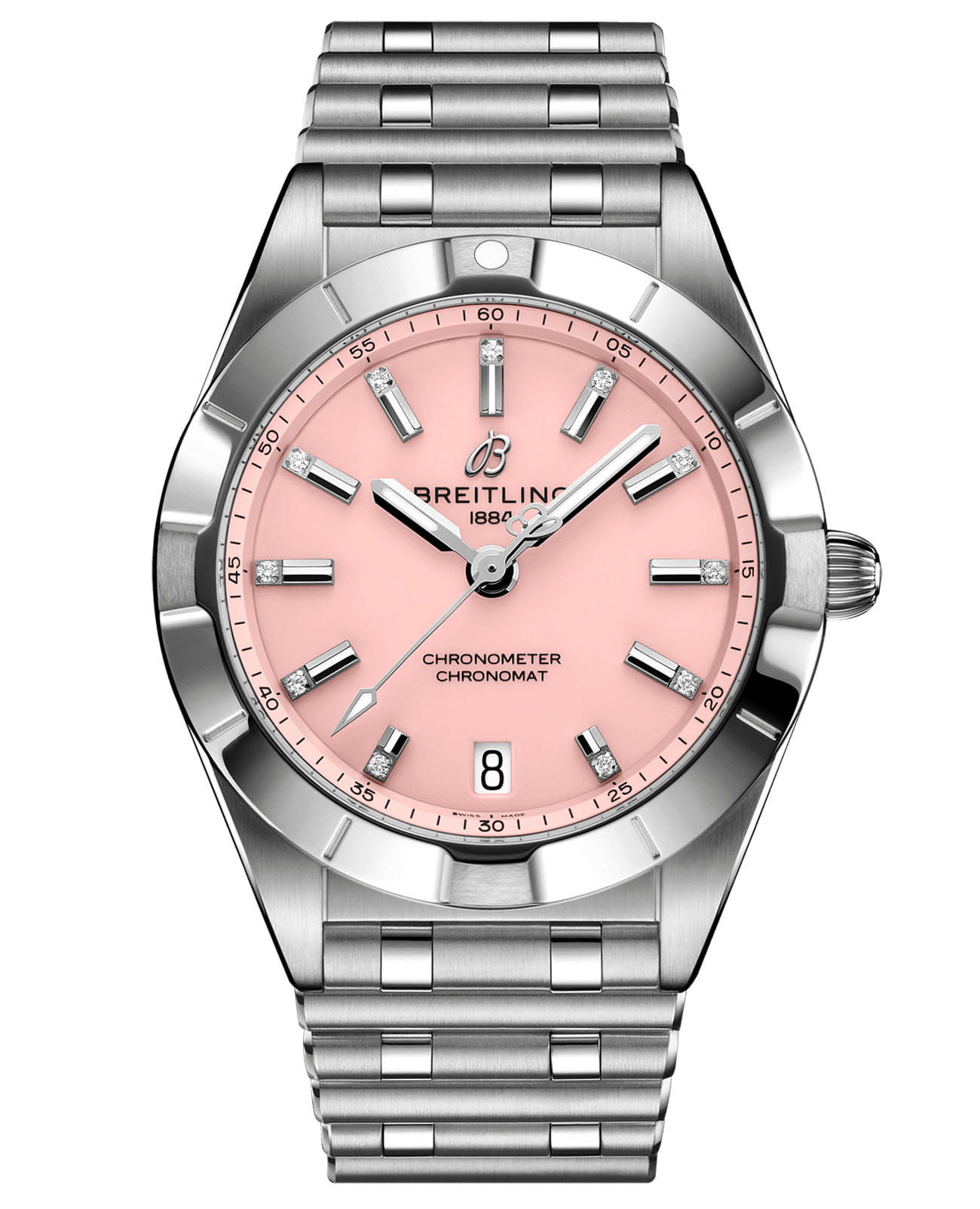 Женские швейцарские часы Breitling Chronomat Automatic 32 A77310101K1A1, калибр Breitling Caliber 77 – термокомпенсирующийся кварцевый механизм SuperQuartz™  с индикатором срока замены батареи, сертифицированным Швейцарским институтом официального тестирования хронометров (COSC).