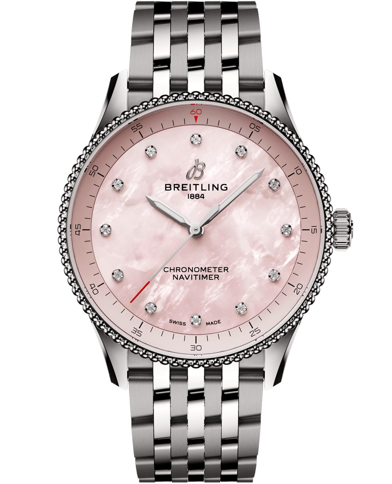 Швейцарские унисекс часы-хронометр Breitling Navitimer Automatic 32 A77320D91K1A1, механический механизм (автоматический калибр) с высокой точностью. Сапфировое стеклоСапфировое стеклоПрочный и надёжный материал из кристалла сапфира синтетического происхождения, характеризующийся особой твёрдостью и устойчивостью к царапинам и повреждениям. устойчивое к появлению царапин, обладающее высокой прозрачностью. Класс водозащиты: 50 метров, позволит защитить корпус от случайных брызг или капель дождя. Корпус и браслет часов изготовлены из нержавеющей стали. Стальной браслет на застёжке-бабочке с кнопкамиЗастёжка "бабочка"Такой вид застёжки дополняется предохранителями, помогающими избежать случайного раскрытия браслета. Обладают изящным исполнением. . Стрелки с люминесцентным покрытиемЛюминесцентное покрытиеПозволяет считывать показания времени в темноте. Производители наносят на стрелки, часовые индексы, безель или поверхность циферблата светонакопительный состав, дающий холодное свечение.. Циферблат инкрустирован бриллантами.