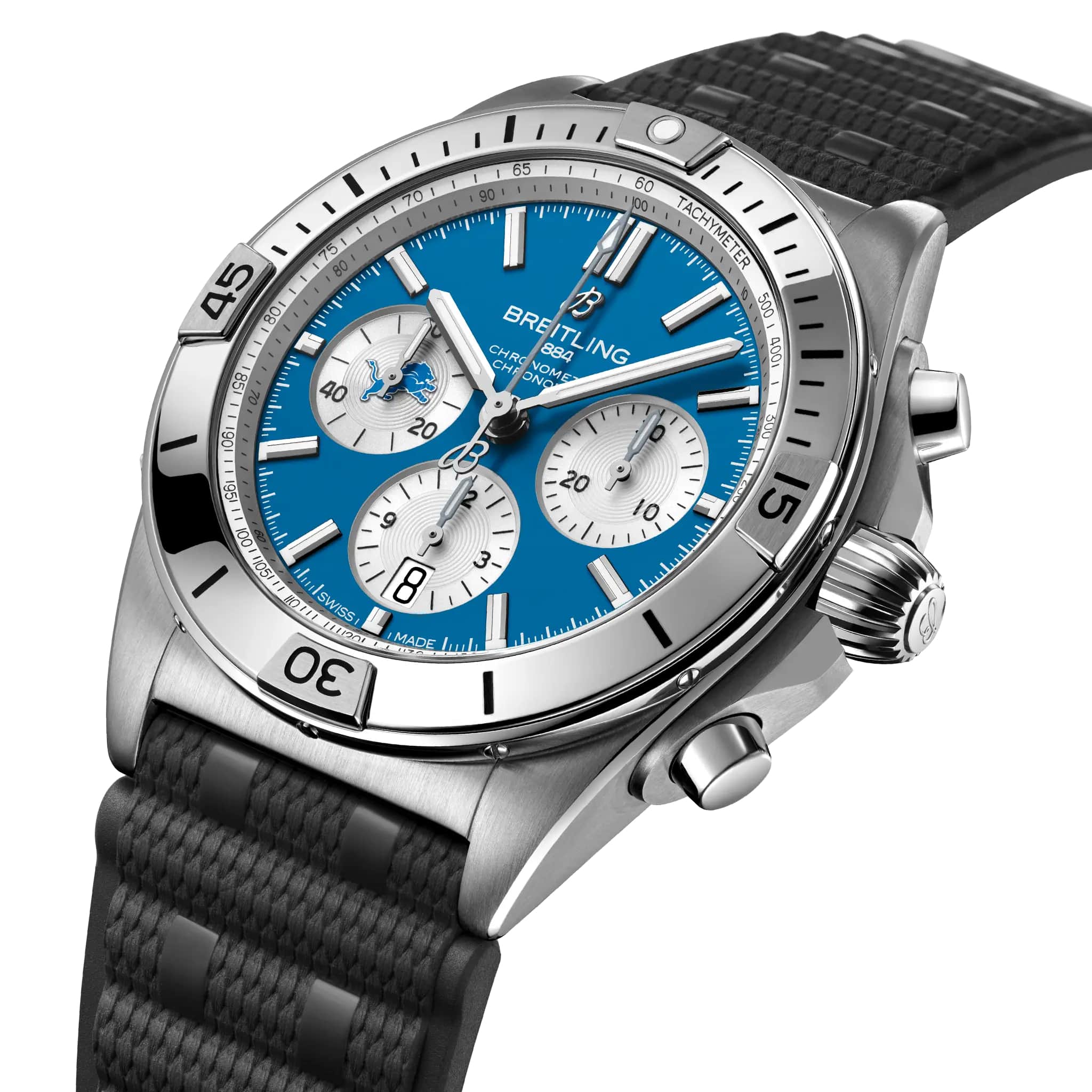Мужские швейцарские часы-хронограф с секундомером Breitling B01 42 NFL Detroit Lions Edition AB01342B1CCS1, механический механизм (автоматический калибр) с высокой точностью. Сапфировое стеклоСапфировое стеклоПрочный и надёжный материал из кристалла сапфира синтетического происхождения, характеризующийся особой твёрдостью и устойчивостью к царапинам и повреждениям. устойчивое к появлению царапин, обладающее высокой прозрачностью. Класс водозащиты: 200 метров, позволит плавать, нырять и заниматься другими водными видами спорта. Корпус часов изготовлен из нержавеющей стали. Браслет из каучука на раскладной застёжкеРаскладная застёжкаТакой тип застёжки используется только на браслетах из металла. Она никогда не раскрывается полностью, происходит разделение на 2 и более частей. Раскладывающая застёжка снизит вероятность потери часов к минимуму.. Стрелки и метки с люминесцентным покрытиемЛюминесцентное покрытиеПозволяет считывать показания времени в темноте. Производители наносят на стрелки, часовые индексы, безель или поверхность циферблата светонакопительный состав, дающий холодное свечение.. Шкала тахиметра на циферблате. Окошко даты находится в положении 6 часов.