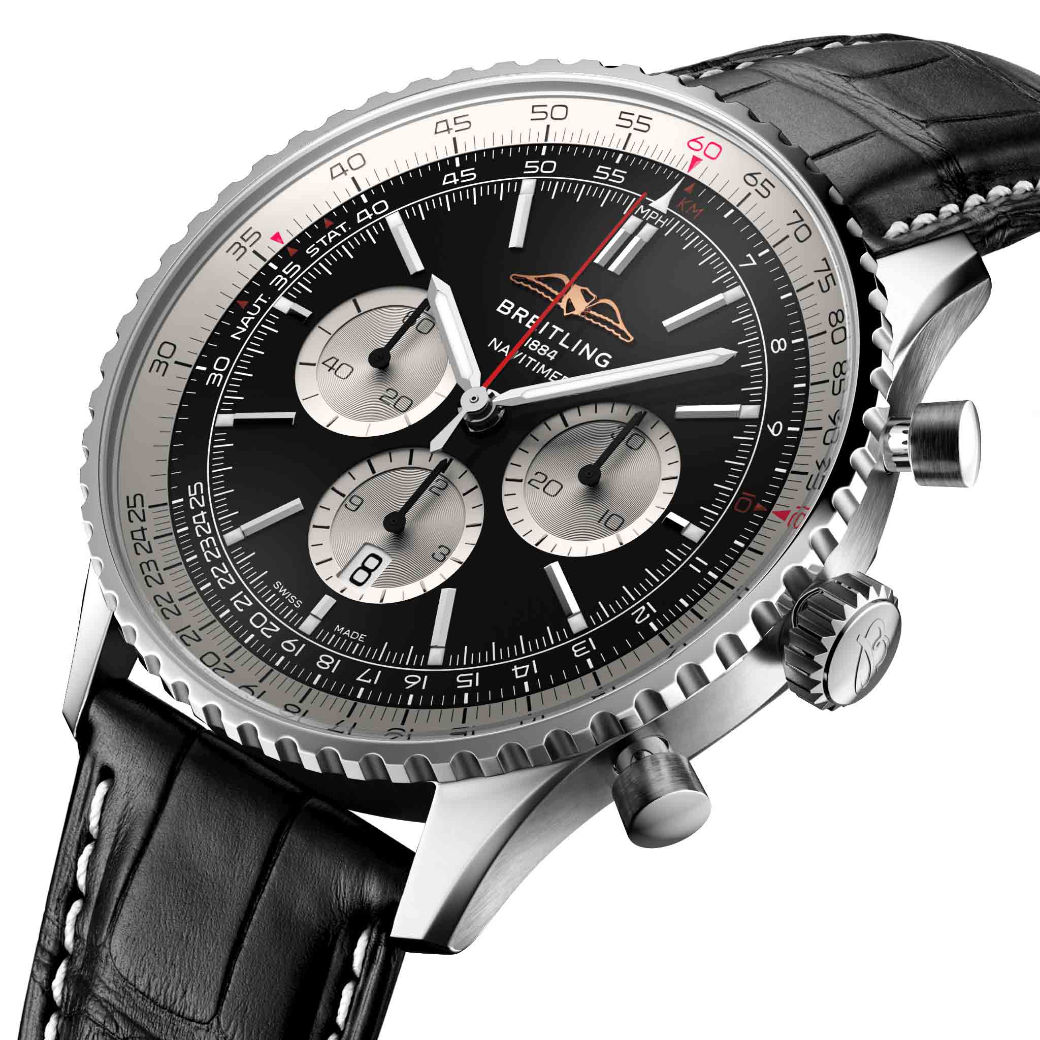 Мужские швейцарские часы-хронографХронографФункция позволяет измерять отрезки времени с особой точностью: часы, минуты, секунды. Верным признаком хронографа является наличие на циферблате 3 дополнительных окошек-счётчиков. с секундомеромСекундомерСекундоме́р — прибор, способный измерять интервалы времени с точностью до долей секунды. Breitling Navitimer B01 Chronograph 46 AB0137211B1P1, механический механизм (автоматический калибр) с высокой точностью. Сапфировое стеклоСапфировое стеклоПрочный и надёжный материал из кристалла сапфира синтетического происхождения, характеризующийся особой твёрдостью и устойчивостью к царапинам и повреждениям. устойчивое к появлению царапин, обладающее высокой прозрачностью. Класс водозащиты: 30 метров, позволит защитить корпус от случайных брызг или капель дождя. Корпус часов изготовлен из стали. Кожаный крокодиловый ремешок с раскладной застёжкойРаскладная застёжкаТакой тип застёжки используется только на браслетах из металла. Она никогда не раскрывается полностью, происходит разделение на 2 и более частей. Раскладывающая застёжка снизит вероятность потери часов к минимуму.. Шкала тахиметраТахиметрРазмеченная шкала, располагается на ободке или безеле часов. Тахиметр позволяет рассчитать скорость на определённом участке пути, расстояние измеряется в километрах или милях. на циферблате. Часы имеют сертификат COSCСертификат COSCОфициальный сертификат, подтверждающий то, что часы ходят с особо высокой точностью. Для получения документа часы подвергаются тестовым испытаниям, разработанным швейцарским институтом тестирования хронометров COSC. Допустимая норма для механических часов -4/+6 секунд в день, для кварцевых моделей +/- 0,07 секунд в день.. Окошко даты находится в положении 6 часов. Стрелки и метки с люминесцентным покрытиемЛюминесцентное покрытиеПозволяет считывать показания времени в темноте. Производители наносят на стрелки, часовые индексы, безель или поверхность циферблата светонакопительный состав, дающий холодное свечение..