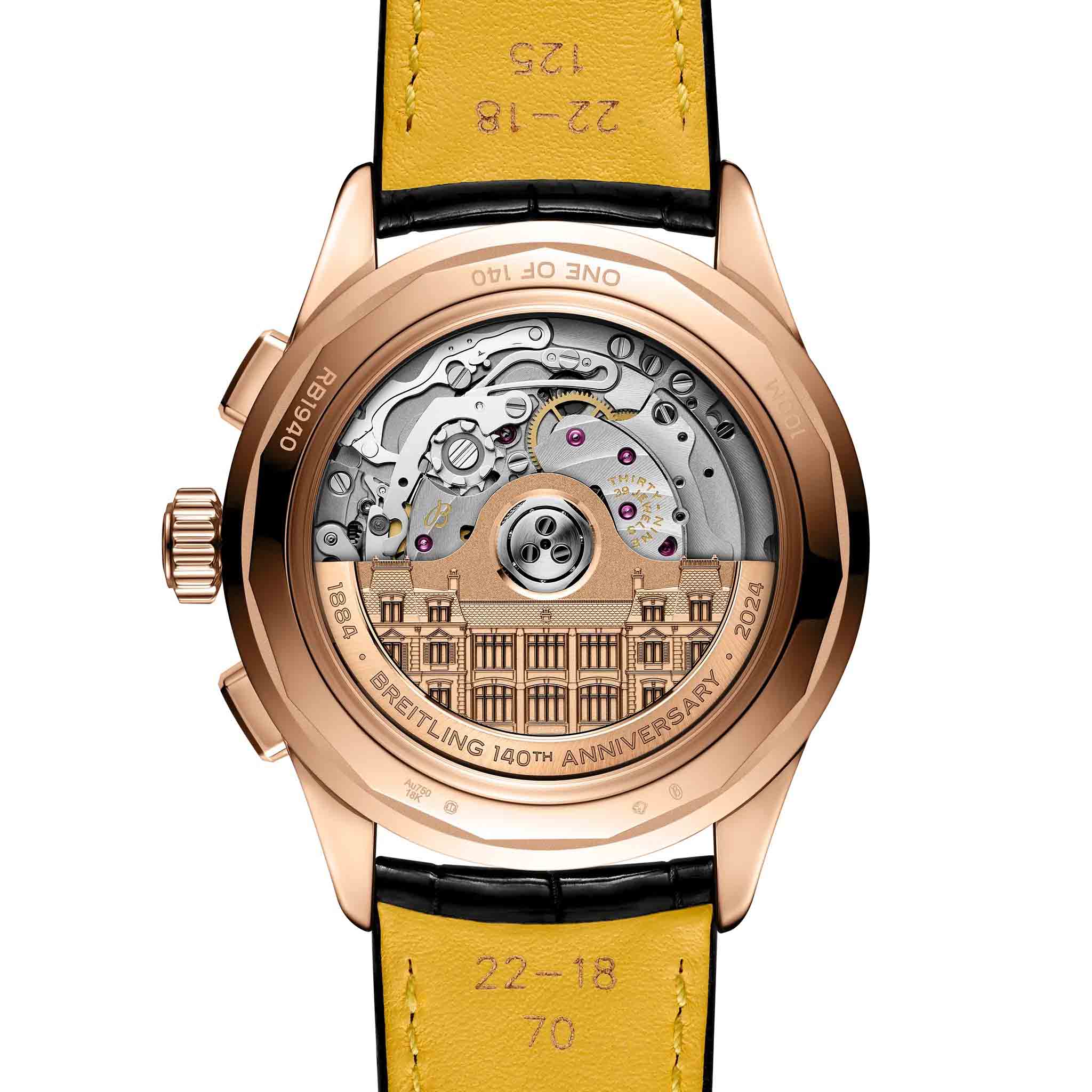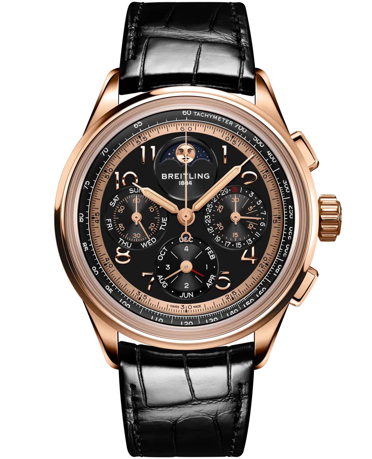 Мужские механические часы Breitling Premier RB19401A1B1P1 — это роскошный аксессуар, сочетающий в себе классический стиль и передовые технологии. Модель выполнена из 18-каратного красного золота с диаметром корпуса 42 мм и толщиной 15,6 мм, что делает её прочной и устойчивой к царапинам. Циферблат черного цвета дополнен индикатором фаз Луны, а его поверхность защищена выпуклым сапфировым стекломСапфировое стеклоПрочный и надёжный материал из кристалла сапфира синтетического происхождения, характеризующийся особой твёрдостью и устойчивостью к царапинам и повреждениям. с двусторонним антибликовым покрытиемАнтибликовое покрытиеСлой оксида металла в 0,13-0,3 микрон, благодаря которому стекло часов не бликует и не отражает свет. Антибликовое покрытие уменьшает отражение света в 10 раз, обеспечивая отличную читаемость показателей циферблата., устойчивым к повреждениям. Стрелки оснащены Люминесцентным покрытиемЛюминесцентное покрытиеПозволяет считывать показания времени в темноте. Производители наносят на стрелки, часовые индексы, безель или поверхность циферблата светонакопительный состав, дающий холодное свечение.Часы оснащены мануфактурным автоматическим механизмом Breitling Caliber 19, обеспечивающим запас хода до 96 часов и частоту колебаний 28 800 полуколебаний в час. Функции включают отображение времени,  хронографХронографФункция позволяет измерять отрезки времени с особой точностью: часы, минуты, секунды. Верным признаком хронографа является наличие на циферблате 3 дополнительных окошек-счётчиков. с точностью 1/4 секунды и временем измерения до 30 минут, а также вечный календарь с указанием фаз Луны. Водонепроницаемость позволяет плавать без, глубокого погружения Ремешок из черной кожи аллигатора шириной 22 мм оснащён раскладной застёжкойРаскладная застёжкаТакой тип застёжки используется только на браслетах из металла. Она никогда не раскрывается полностью, происходит разделение на 2 и более частей. Раскладывающая застёжка снизит вероятность потери часов к минимуму. с фиксатором, обеспечивающей комфорт и надёжную фиксацию на запястье. На задней крышке выгравирован логотип, подтверждающий уникальность изделия. Это лимитированная серия, выпущенная всего 140 экземпляров, что подчёркивает её уникальность. Гарантия 2 года подтверждает качество и долговечность изделия. Эти часы станут универсальным аксессуаром для тех, кто ценит сочетание стиля, функциональности и швейцарского мастерства — идеальный выбор для повседневной носки и торжественных случаев.