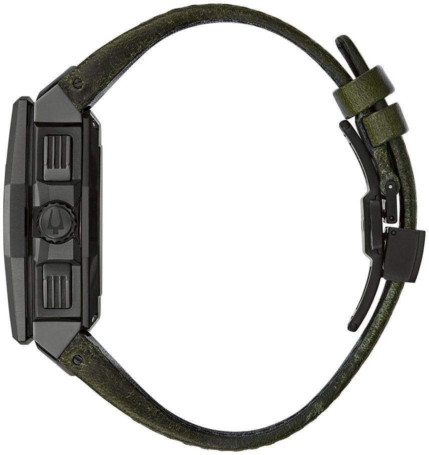 Мужские кварцевые часы-хронографХронографФункция позволяет измерять отрезки времени с особой точностью: часы, минуты, секунды. Верным признаком хронографа является наличие на циферблате 3 дополнительных окошек-счётчиков. с секундомеромСекундомерСекундоме́р — прибор, способный измерять интервалы времени с точностью до долей секунды. Bulova Precisionist X Special Edition 98B355 – отражающий идеальное сочетание современного дизайна, надёжности и функциональности. Сверхточный кварцевый хронограф. Частота колебаний механизма составляет 262 кГц , что превышает мировой стандарт в 8 раз. Корпус из нержавеющей стали с PVD-покрытиемPVDУльтратонкое покрытие наносится в технике вакуумного напыления, сочетает в себе нитрид титана особой прочности со слоем золота или оксида хрома. Несёт в себе декоративную или защитную функцию. черного цвета, диаметром 44.5 мм идеально сбалансирован и надежен. Сапфировое стеклоСапфировое стеклоПрочный и надёжный материал из кристалла сапфира синтетического происхождения, характеризующийся особой твёрдостью и устойчивостью к царапинам и повреждениям. защищает циферблат от царапин и устойчивое к механическим повреждениям. На черном циферблате есть окошко календаря. Кожаный ремешок на застёжке-бабочке с кнопкамиЗастёжка "бабочка"Такой вид застёжки дополняется предохранителями, помогающими избежать случайного раскрытия браслета. Обладают изящным исполнением. обеспечивает комфортное ношение. Водозащита 50 метров позволит защитить корпус от случайных брызг или капель дождя. Стрелки и метки с люминесцентным покрытиемЛюминесцентное покрытиеПозволяет считывать показания времени в темноте. Производители наносят на стрелки, часовые индексы, безель или поверхность циферблата светонакопительный состав, дающий холодное свечение. позволяющие легко определять время даже в темноте. Эта модель – отличный выбор для тех, кто ищет сочетание стиля, качества и функциональности. Часы станут не только полезным аксессуаром, но и выразительным элементом вашего имиджа.