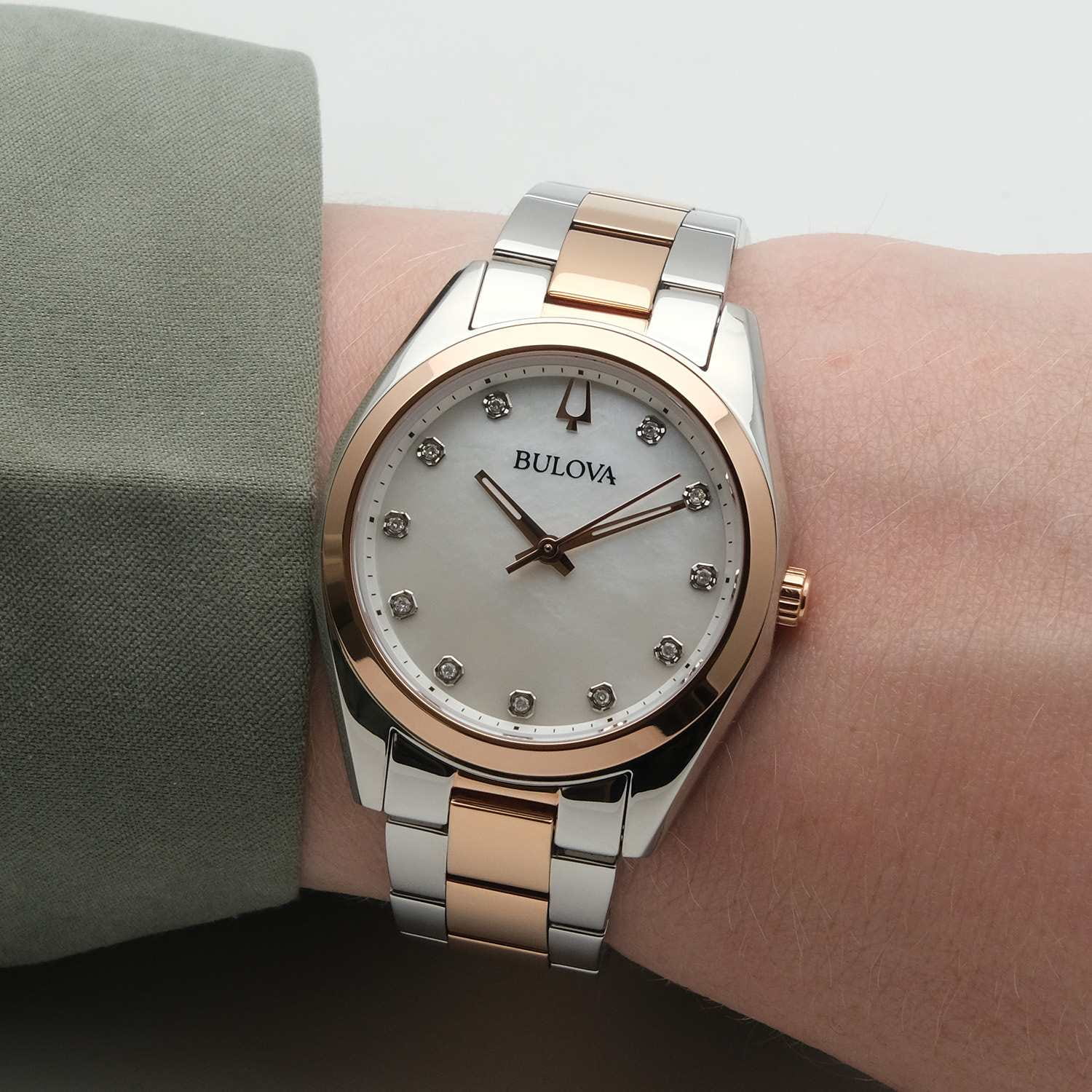 Женские кварцевые часы Bulova Surveyor 98P207 – отражающий идеальное сочетание современного дизайна, надёжности и функциональности. Элегантный облик станет превосходным завершением образа, наделив его индивидуальным характером. Корпус из нержавеющей стали серебристого цвета, диаметром 31 мм идеально сбалансирован и элегантен. Минеральное стеклоМинеральное стеклоМинеральное стекло представляет собой искусственно выращенный минерал кварца. Такое стекло отличается особой устойчивостью к повреждениям и царапинам. Уступает по некоторым качествам сапфировому стеклу. защищает циферблат от царапин и устойчивое к мелким механическим повреждениям. Неподвижный безельБезельВнешний ободок, закрепляющий стекло. В спортивных часах так называется поворотное кольцо с делениями на циферблате, выполняет роль таймера – замеряет отрезки времени на шкале. Неподвижный безель – элемент декора. Однонаправленно вращающийся безель на дайверских часах позволяет фиксировать моменты погружения и выныривания на поверхность. с IP-покрытиемIP-покрытиеМетод ионного напыления. Демонстрирует повышенную устойчивость к истиранию, окислению и химическим веществам. Под воздействием высокого давления и температуры около 1500°C молекулы металла надёжно соединяются с частицами корпуса часов. цвета розового золота. Циферблат украшен бриллиантами. Стальной браслет с частичным IP-покрытиемIP-покрытиеМетод ионного напыления. Демонстрирует повышенную устойчивость к истиранию, окислению и химическим веществам. Под воздействием высокого давления и температуры около 1500°C молекулы металла надёжно соединяются с частицами корпуса часов. на застёжке-бабочке с кнопкамиЗастёжка "бабочка"Такой вид застёжки дополняется предохранителями, помогающими избежать случайного раскрытия браслета. Обладают изящным исполнением. обеспечивает комфортное ношение. Стрелки с люминесцентным покрытиемЛюминесцентное покрытиеПозволяет считывать показания времени в темноте. Производители наносят на стрелки, часовые индексы, безель или поверхность циферблата светонакопительный состав, дающий холодное свечение.. Водозащита 30 метров позволит защитить корпус от случайных брызг или капель дождя. Эта модель – отличный выбор для тех, кто ищет сочетание стиля, качества и функциональности. Часы станут не только полезным аксессуаром, но и выразительным элементом вашего имиджа.