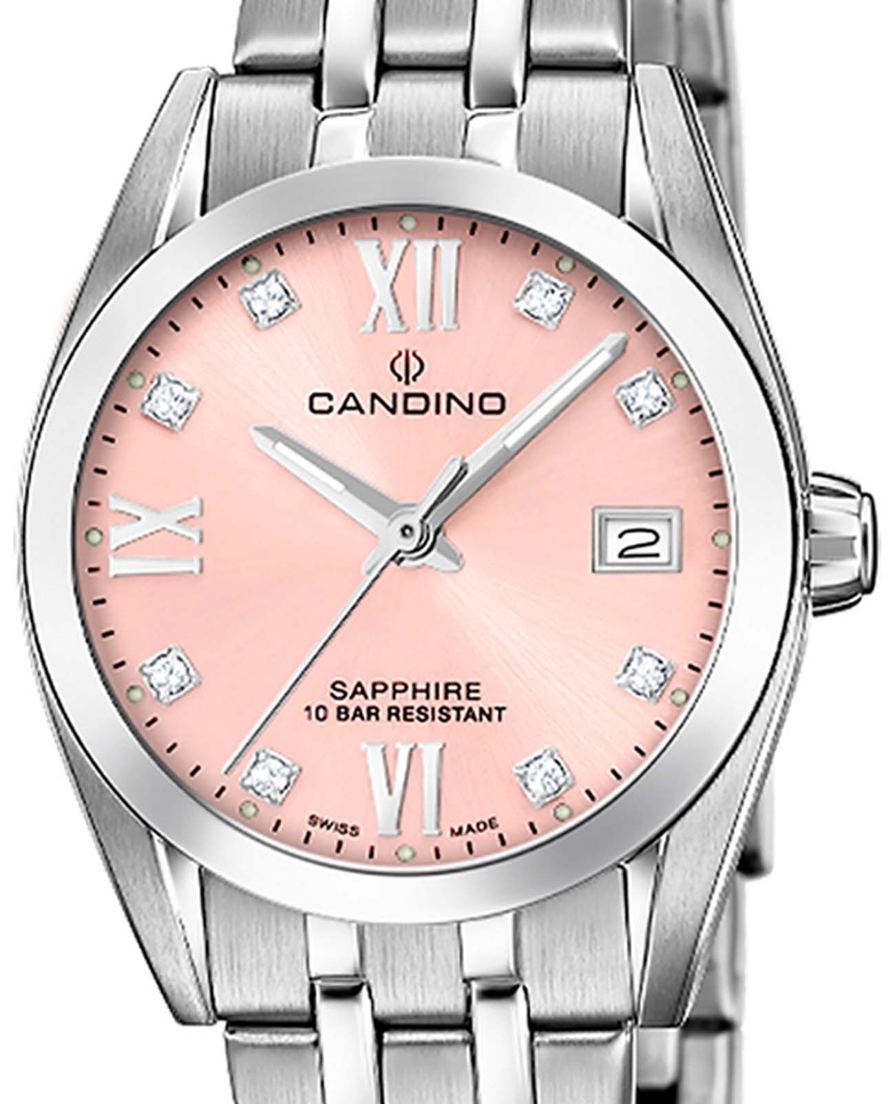Женские швейцарские часы с сапфировым стекломСапфировое стеклоПрочный и надёжный материал из кристалла сапфира синтетического происхождения, характеризующийся особой твёрдостью и устойчивостью к царапинам и повреждениям. Candino Couple Quartz C4703/E, кварцевый механизм с высокой точностью. Сапфировое стеклоСапфировое стеклоПрочный и надёжный материал из кристалла сапфира синтетического происхождения, характеризующийся особой твёрдостью и устойчивостью к царапинам и повреждениям. устойчивое к появлению царапин, обладающее высокой прозрачностью. Класс водозащиты: 100 метров, позволит плавать, нырять и заниматься другими водными видами спорта. Корпус часов изготовлен из стали. Браслет с раскладной застёжкойРаскладная застёжкаТакой тип застёжки используется только на браслетах из металла. Она никогда не раскрывается полностью, происходит разделение на 2 и более частей. Раскладывающая застёжка снизит вероятность потери часов к минимуму.. Стрелки с люминесцентным покрытиемЛюминесцентное покрытиеПозволяет считывать показания времени в темноте. Производители наносят на стрелки, часовые индексы, безель или поверхность циферблата светонакопительный состав, дающий холодное свечение.. Окошко даты находится в положении 3 часа.