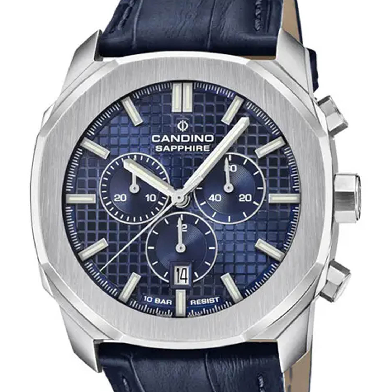 Швейцарские мужские наручные часы-хронографХронографФункция позволяет измерять отрезки времени с особой точностью: часы, минуты, секунды. Верным признаком хронографа является наличие на циферблате 3 дополнительных окошек-счётчиков. Candino Chronos Carree C4747/2, кварцевый механизм с высокой точностью. Сапфировое стеклоСапфировое стеклоПрочный и надёжный материал из кристалла сапфира синтетического происхождения, характеризующийся особой твёрдостью и устойчивостью к царапинам и повреждениям. устойчивое к появлению царапин, обладающее высокой прозрачностью. Часы, минуты, секунды. Индикация даты. Класс водозащиты: 100 метров, позволит плавать, нырять и заниматься другими водными видами спорта. Корпус часов изготовлен из нержавеющей стали. Стрелки и метки с люминесцентным покрытиемЛюминесцентное покрытиеПозволяет считывать показания времени в темноте. Производители наносят на стрелки, часовые индексы, безель или поверхность циферблата светонакопительный состав, дающий холодное свечение..
