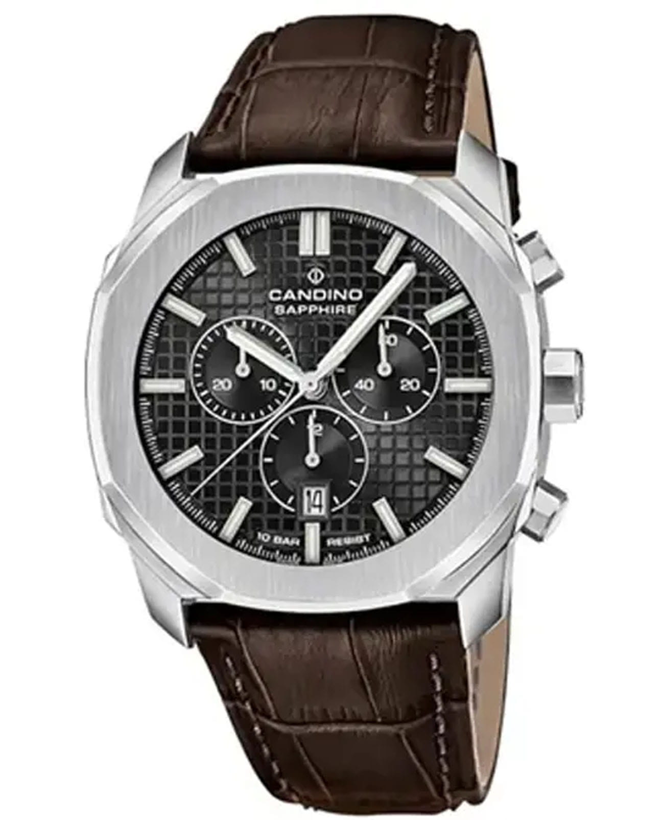 Швейцарские мужские наручные часы-хронографХронографФункция позволяет измерять отрезки времени с особой точностью: часы, минуты, секунды. Верным признаком хронографа является наличие на циферблате 3 дополнительных окошек-счётчиков. Candino Chronos Carree C4747/4, кварцевый механизм с высокой точностью. Сапфировое стеклоСапфировое стеклоПрочный и надёжный материал из кристалла сапфира синтетического происхождения, характеризующийся особой твёрдостью и устойчивостью к царапинам и повреждениям. устойчивое к появлению царапин, обладающее высокой прозрачностью. Часы, минуты, секунды. Индикация даты. Класс водозащиты: 100 метров, позволит плавать, нырять и заниматься другими водными видами спорта. Корпус часов изготовлен из нержавеющей стали. Стрелки и метки с люминесцентным покрытиемЛюминесцентное покрытиеПозволяет считывать показания времени в темноте. Производители наносят на стрелки, часовые индексы, безель или поверхность циферблата светонакопительный состав, дающий холодное свечение..