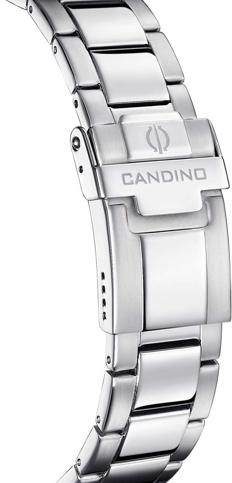 Мужские наручные часы-хронографХронографФункция позволяет измерять отрезки времени с особой точностью: часы, минуты, секунды. Верным признаком хронографа является наличие на циферблате 3 дополнительных окошек-счётчиков. Candino C4757/C из коллекции Gents Sport сочетают в себе спортивный дизайн и надежность швейцарских технологий. Модель обладает круглым корпусом диаметром 45 мм, изготовленным из нержавеющей стали , что обеспечивает высокую устойчивость к коррозии и внешним воздействиям . Браслет выполнен из нержавеющей стали с раскладной застежкойРаскладная застёжкаТакой тип застёжки используется только на браслетах из металла. Она никогда не раскрывается полностью, происходит разделение на 2 и более частей. Раскладывающая застёжка снизит вероятность потери часов к минимуму., гарантирующей комфортное ношение и безопасность . Серебристый циферблат оснащен окном даты и функцией люминесцентного покрытияЛюминесцентное покрытиеПозволяет считывать показания времени в темноте. Производители наносят на стрелки, часовые индексы, безель или поверхность циферблата светонакопительный состав, дающий холодное свечение., что позволяет легко считывать показания времени даже в темноте . Для защиты используется сапфировое стеклоСапфировое стеклоПрочный и надёжный материал из кристалла сапфира синтетического происхождения, характеризующийся особой твёрдостью и устойчивостью к царапинам и повреждениям., обеспечивающее прочную защиту от царапин и долговечность . Часы работают на кварцевом механизме, проверенном годами качеством и точностью . Модель также является хронографом, оснащенным функцией секундомераСекундомерСекундоме́р — прибор, способный измерять интервалы времени с точностью до долей секунды., делая ее идеальной для активного образа жизни. Водонепроницаемость часов достигает 10 атмосфер (100 метров), что позволяет использовать их во время плавания и других водных видов спорта .