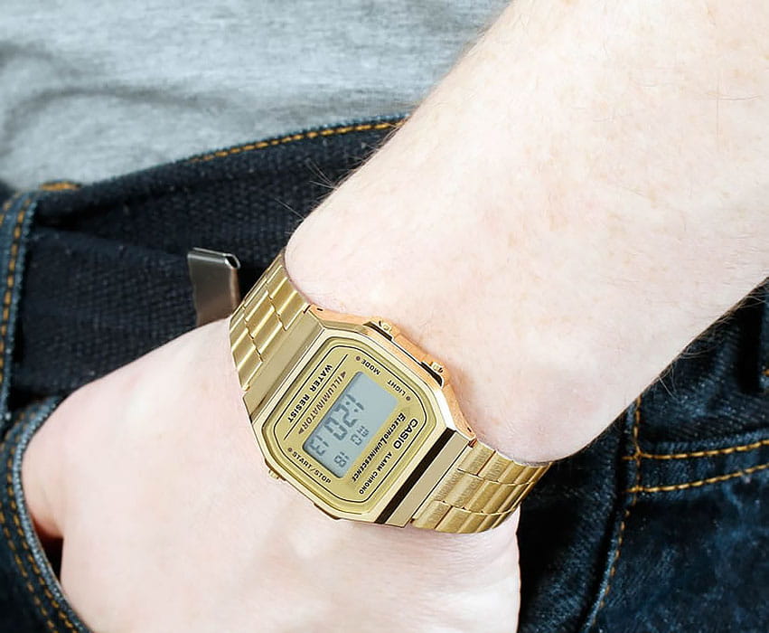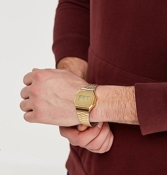 Брендовый аксессуар в золотом цвете имеет IP-покрытиеIP-покрытиеМетод ионного напыления. Демонстрирует повышенную устойчивость к истиранию, окислению и химическим веществам. Под воздействием высокого давления и температуры около 1500°C молекулы металла надёжно соединяются с частицами корпуса часов. стального браслета, защищающее от царапин и изнашивания, а также выполняющее декоративное предназначение. Оригинально смотрится циферблат с узором. Высокоточный кварцевый механизм. Яркая электролюминесцентная подсветка. Противоударный корпусУдаропрочный корпусМеханизм заключён в корпус, выполненный из современных материалов, устойчивых к ударам, механическим повреждениям и падению с высоты: инновационный пластик, карбон, нержавеющая сталь, титан. из надёжного пластика. Удобная застёжка расстёгивается одним касанием. Будильник, автоматический календарь. Габариты: 36,3 x 38,6 x 9,6 мм.