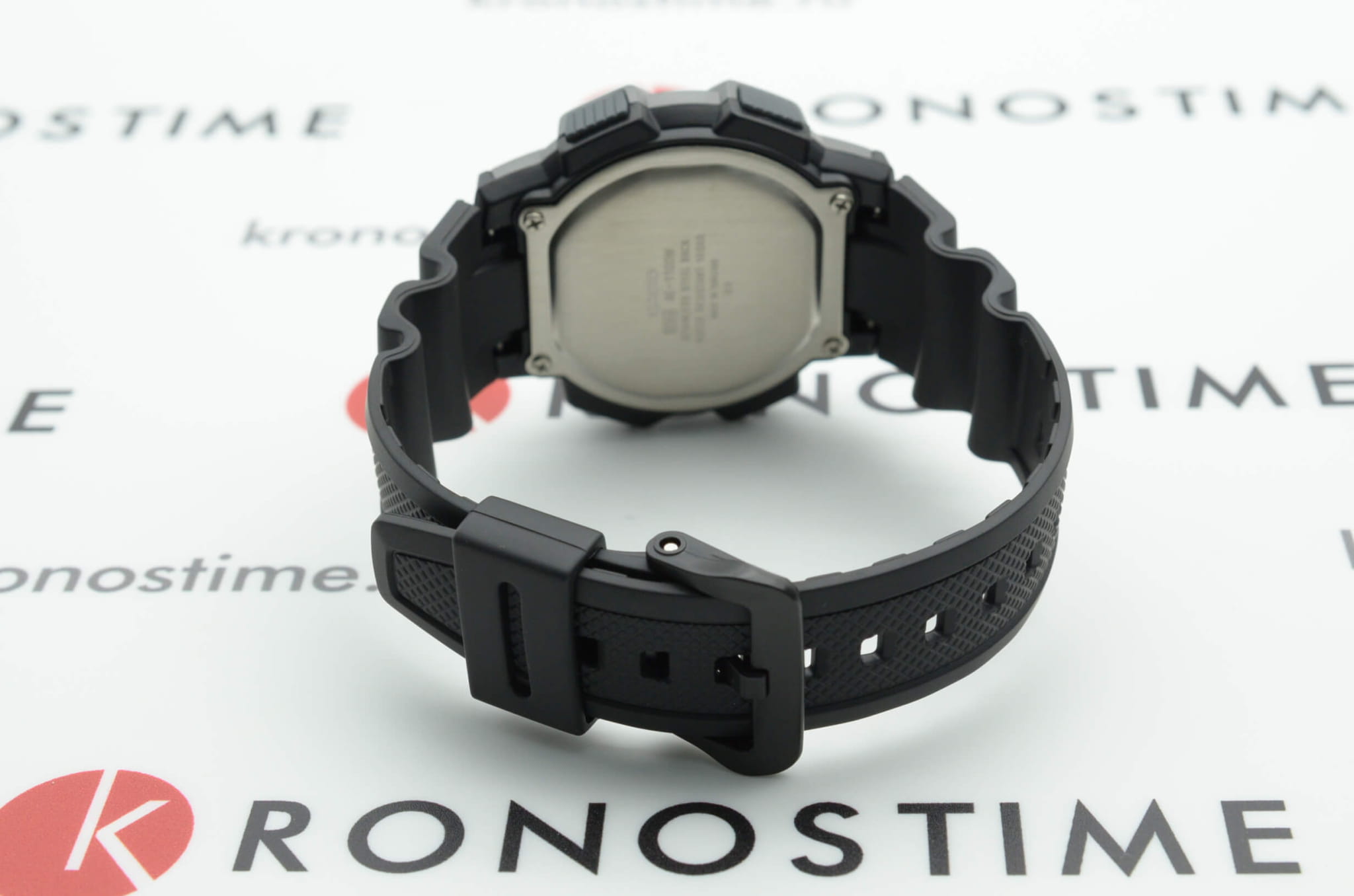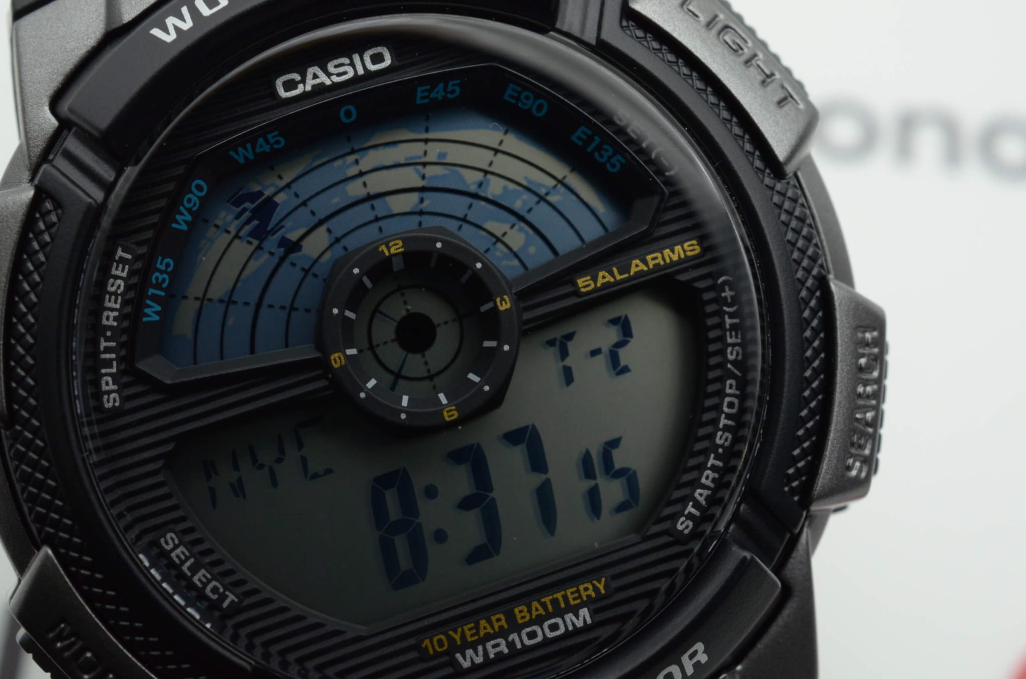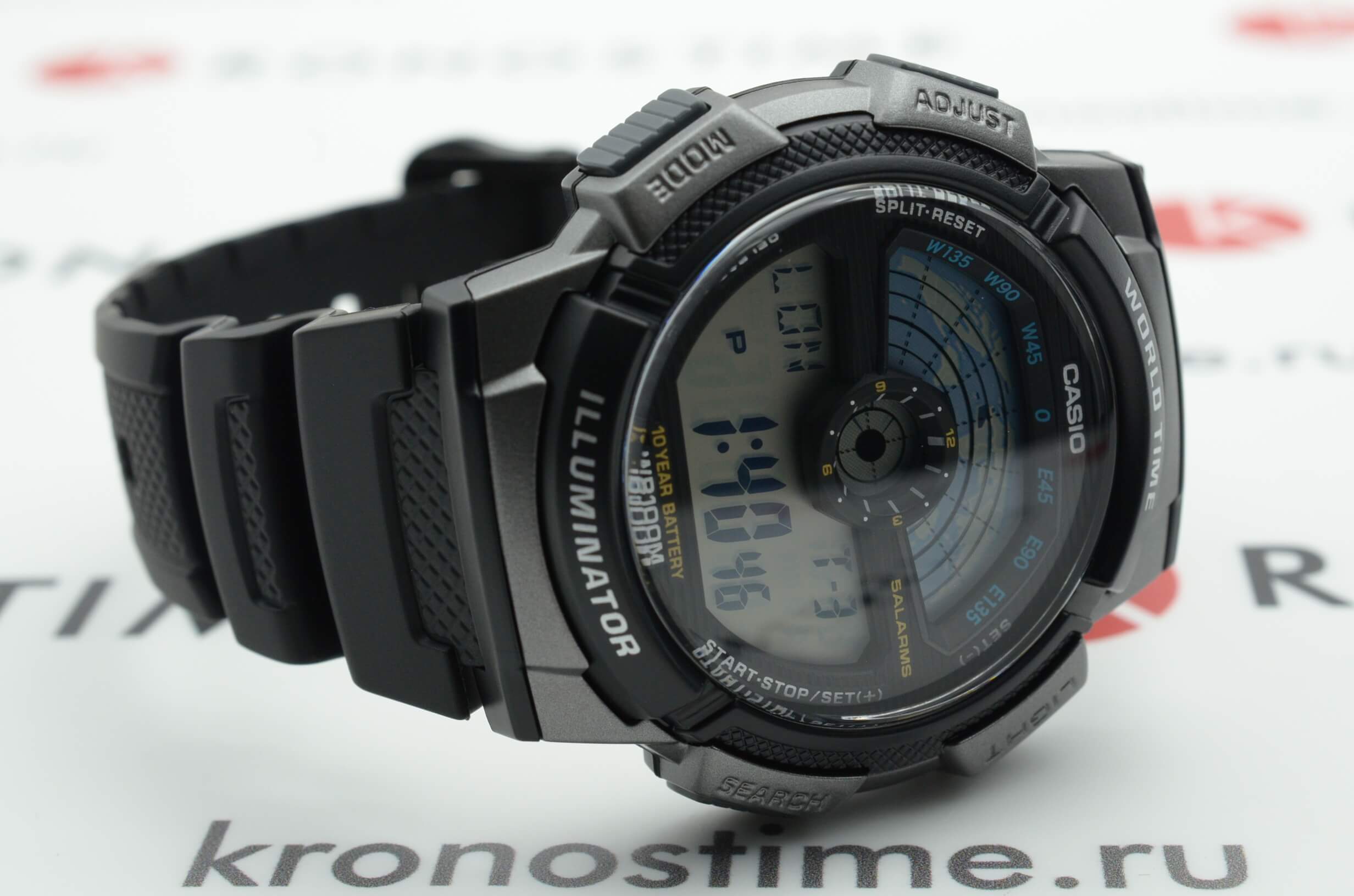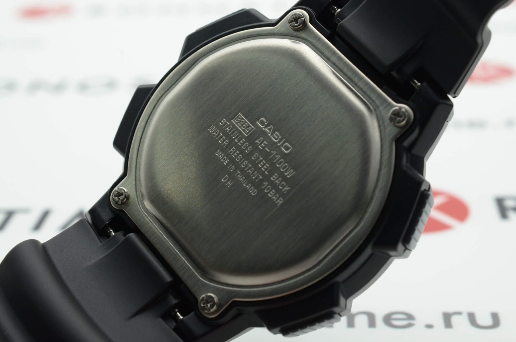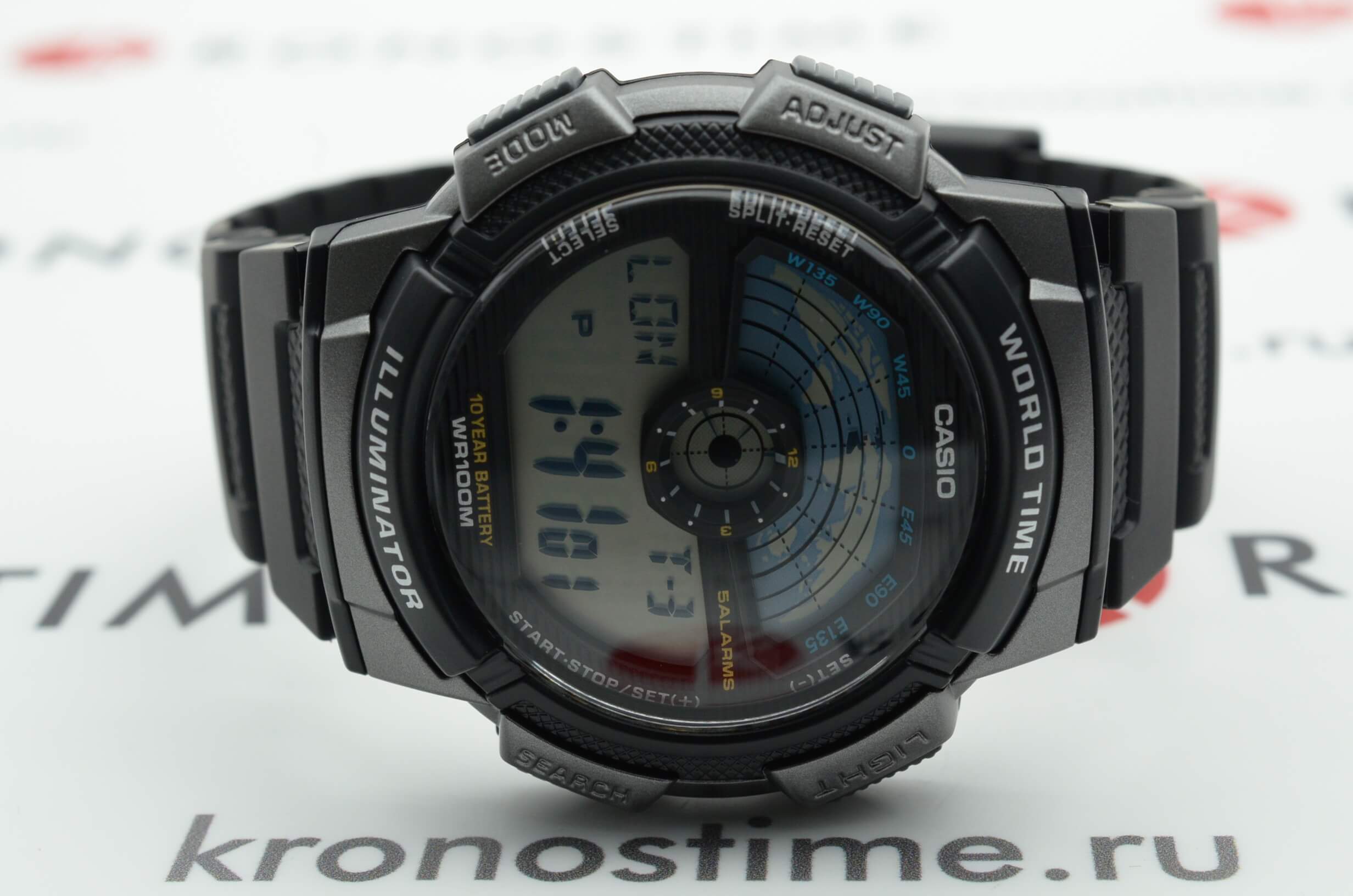 Японские мужские наручные часы AE-1100W-1AER с функцией мирового времени, секундомера, таймера, будильника. Оснащены подсветкой. Корпус - Пластиковый; Стекло - Пластик; Водозащита - 100 м. (WR 100); Материал ремешка - Пластиковый; Цвет ремешка - Черный; Цвет циферблата - Lcd.