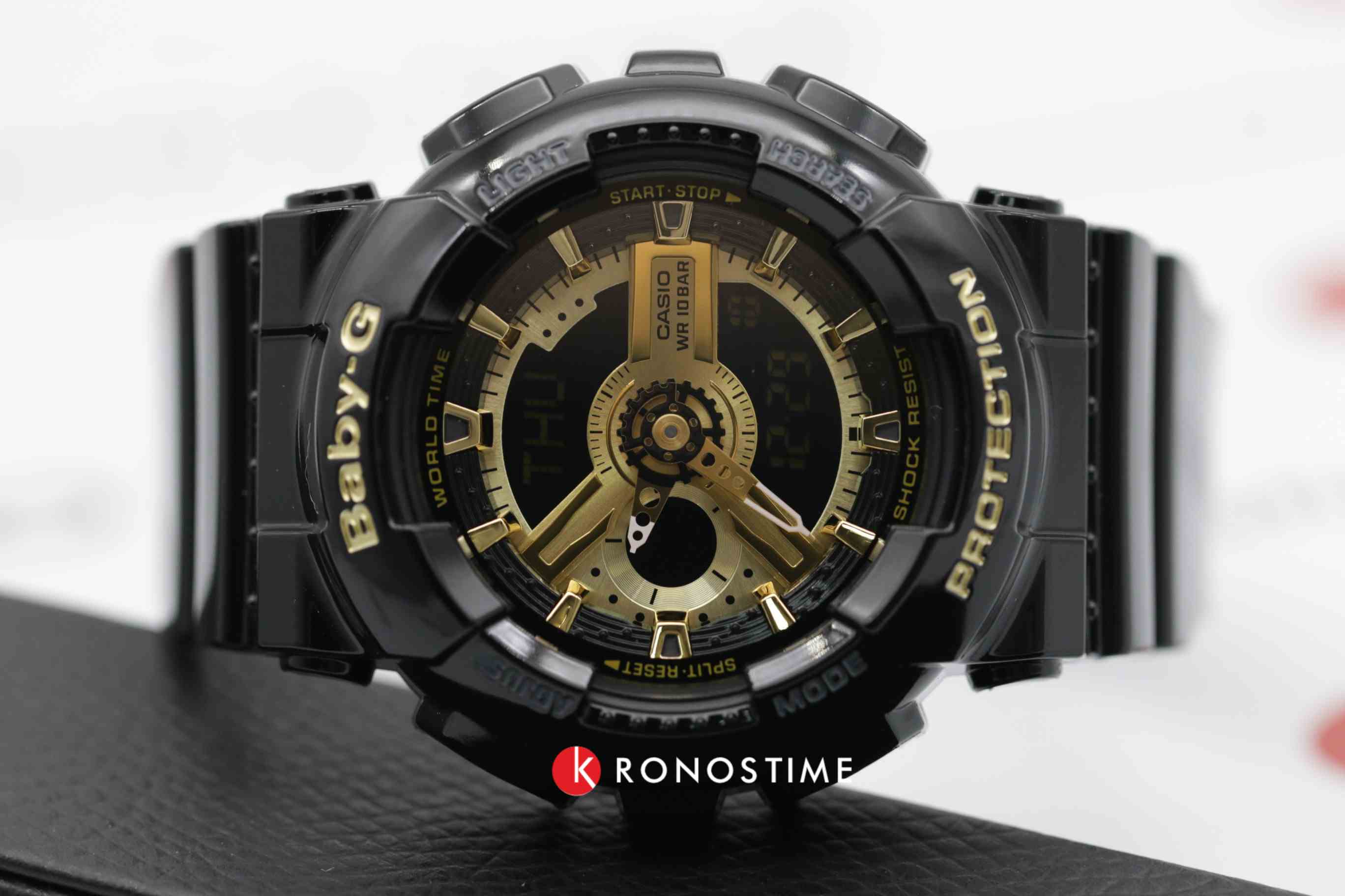 Популярная модель в чёрно-золотистом глянцевом исполнении имеет противоударный корпусУдаропрочный корпусМеханизм заключён в корпус, выполненный из современных материалов, устойчивых к ударам, механическим повреждениям и падению с высоты: инновационный пластик, карбон, нержавеющая сталь, титан., выдерживающий механические повреждения и падение с высоты. Он выполнен из полимерного пластика, такой же материал был выбран для гибкого браслета. Кварцевый механизм работает от батарейки, рассчитанной на 2 года службы. Светодиодная подсветкаСветодиодная подсветкаСветодиодная или LED-подсветка обеспечивает появление яркого холодного свечения за счёт LED-элементов - маленьких лампочек. Они потребляют минимальное количество энергии, чаще всего можно встретить 1 светодиод, в нижней части циферблата. дисплея. Минеральное стекло. Секундомер, будильник, мировое времяМировое время Полезное часовое усложнение, отображающее время в основных городах и известных областях по всему миру, оно связано с часовыми поясами, удобно для путешественников и бизнесменов. , автоматический календарь, таймер. Водостойкость 100 метров. Габариты: 43,4 x 46,3 x 15,8 мм.