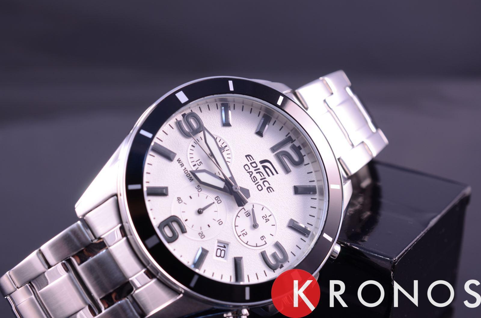 Стильный, мужские наручные часы Casio Edifice надежные и практичные. Кварцевый японский механизм Miyota. Точность хода не хуже -10 +15 сек./в месяц. Часы оснащены функцией хронографа, с точностью 1/10с и временем измерения 1ч. Циферблат белого цвета с контрастными элементами дизайна. Стрелки и индексы с светонакопительным нанесением. Корпус и браслет выполнены из нержавеющей стали. Безель с IP покрытием черного цвета. Минеральное стекло устойчиво к появлению царапин. Водонепроницаемость 100М. В часах можно плавать. Степень водонепроницаемости не является величиной, эквивалентной функциональной рабочей глубине.