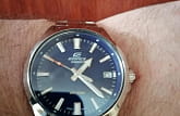 Брендовый аксессуар из серии EFV-100 будет отлично смотреться как с деловым костюмом, так и с повседневной одеждой. Синий циферблат дополнен контрастными стрелками и метками, секундная стрелка облегчает читаемость показателей благодаря яркому наконечнику. Минималистичные часы выполнены из нержавеющей стали 316L, материал отличается долговечностью и устойчивостью к царапинам. Кварцевый механизм работает от батарейки, срок её службы составит 3 года. Люминесцентная подсветка NeobriteЛюминесцентное покрытиеПозволяет считывать показания времени в темноте. Производители наносят на стрелки, часовые индексы, безель или поверхность циферблата светонакопительный состав, дающий холодное свечение.. Водостойкость 10 бар. Минеральное стекло. Прямоугольная апертура даты. Габариты: 48 x 42 x 10,9 мм.