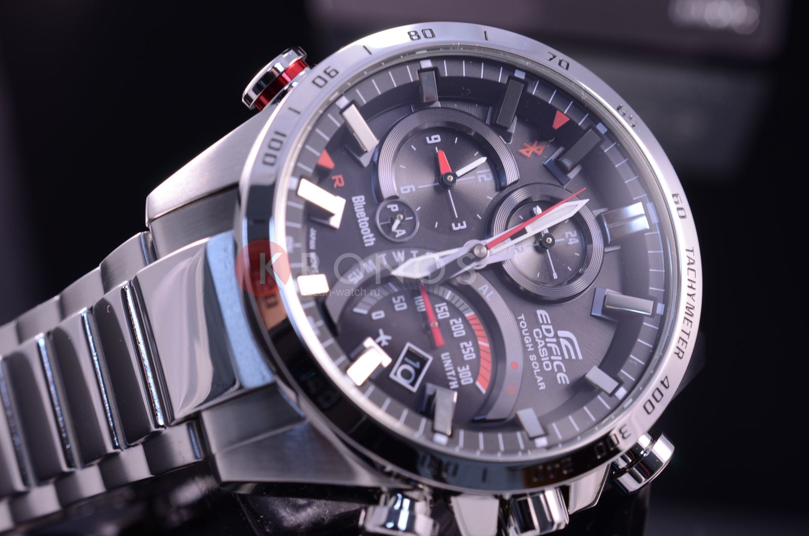 Общее исполнение аксессуара выдержано в автомобильной стилистике, тёмный циферблат отличается оригинальным расположением счётчиков. Наручные часы оснащены технологией BluetoothBluetoothСовременная технология, позволяющая синхронизировать часы с телефоном и переносить данные. Часы с Bluetooth расширяют возможности вашего смартфона и делают его использование ещё более удобным. с низким потреблением энергии, позволяющей часам считывать информацию с интернет-сервера точного времени и обеспечивать абсолютную точность времени. Питание происходит за счёт солнечной батареи - . Водонепроницаемость 100 метров. Минеральное стекло. Люминесцентная подсветкаЛюминесцентное покрытиеПозволяет считывать показания времени в темноте. Производители наносят на стрелки, часовые индексы, безель или поверхность циферблата светонакопительный состав, дающий холодное свечение.. Наличие авиарежима. Функции: уведомление о полученных сообщениях по электронной почте, поиск телефона, отображение числа и дня недели, секундомер, будильник, тахиметрТахиметрРазмеченная шкала, располагается на ободке или безеле часов. Тахиметр позволяет рассчитать скорость на определённом участке пути, расстояние измеряется в километрах или милях., расчёт средней скорости пройденного маршрута. Габариты: 52 x 48,1 x 14,2 мм.