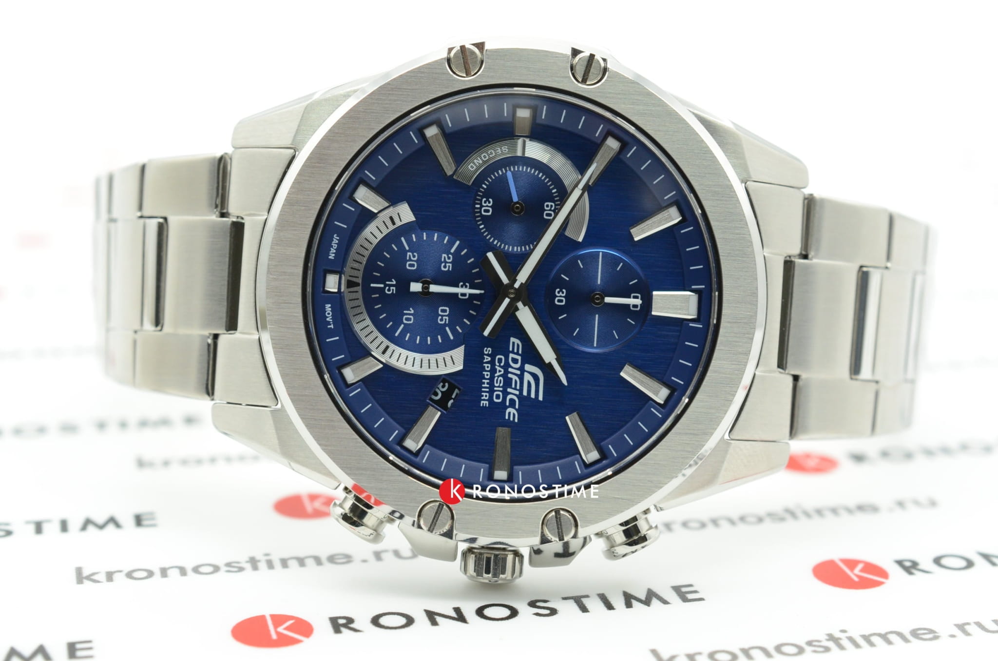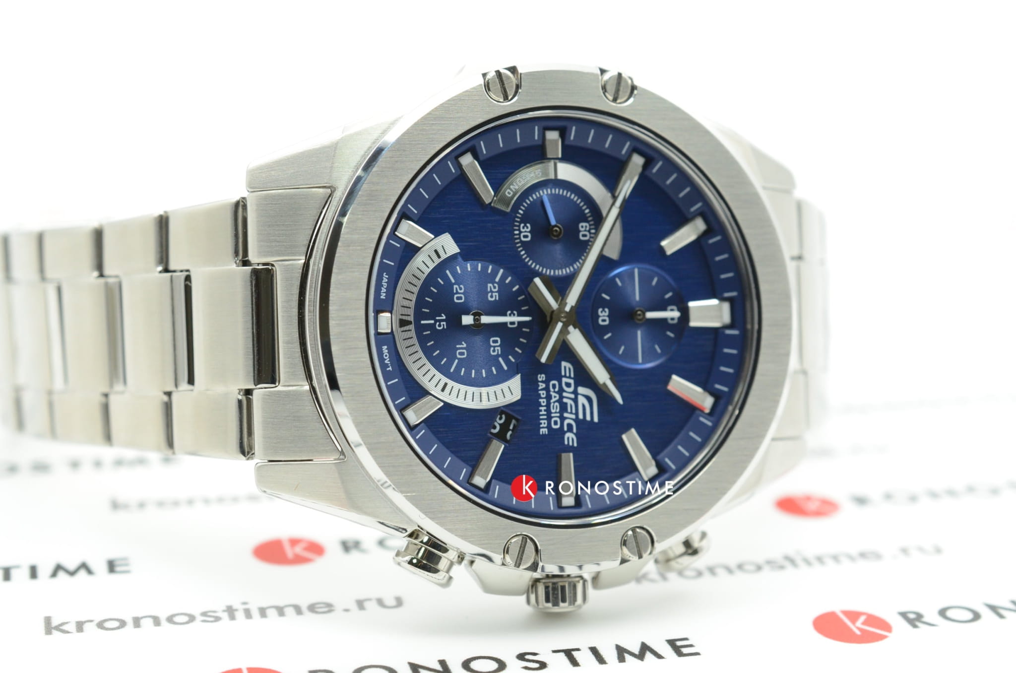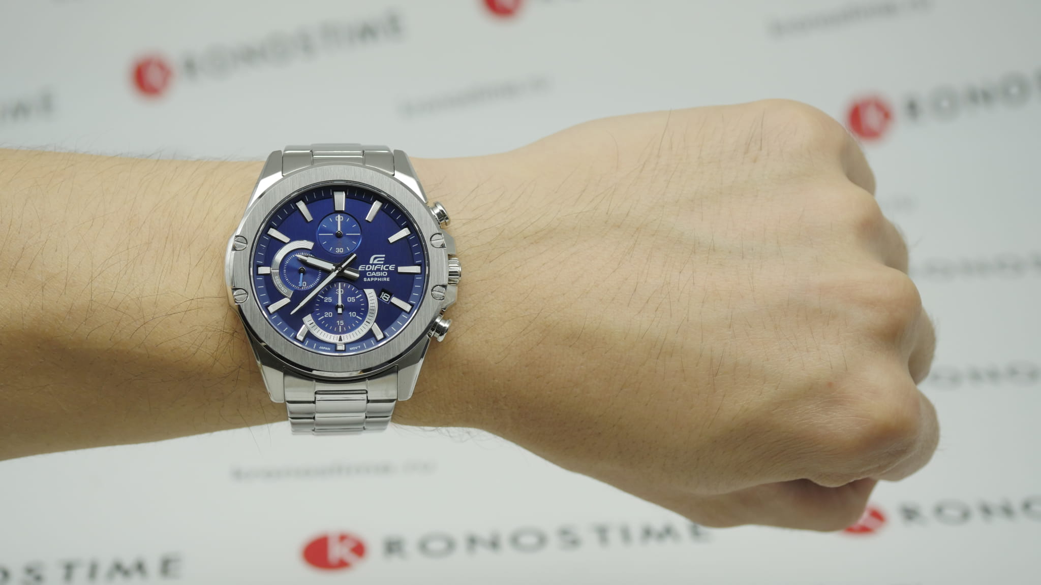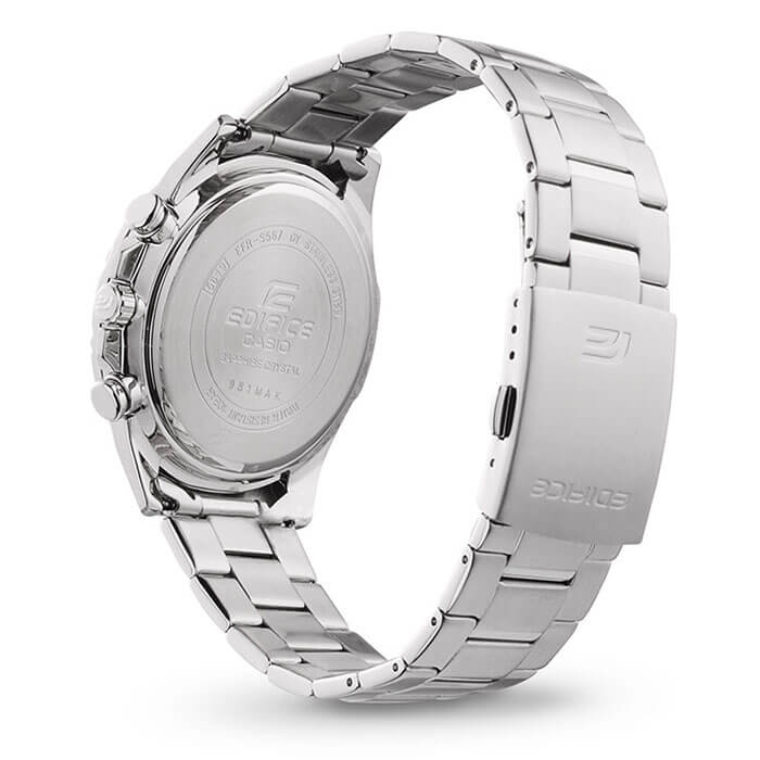 Мужские часы-хронографХронографФункция позволяет измерять отрезки времени с особой точностью: часы, минуты, секунды. Верным признаком хронографа является наличие на циферблате 3 дополнительных окошек-счётчиков. Casio Edifice EFR-S567D-2A, кварцевый механизм с высокой точностью. Минеральное стеклоМинеральное стеклоМинеральное стекло представляет собой искусственно выращенный минерал кварца. Такое стекло отличается особой устойчивостью к повреждениям и царапинам. Уступает по некоторым качествам сапфировому стеклу. устойчивое к появлению царапин, обладающее высокой прозрачностью. СекундомерСекундомерСекундоме́р — прибор, способный измерять интервалы времени с точностью до долей секунды. с точностью показаний 1/10с и временем измерения 1ч. Корпус изготовлен из нержавеющей стали. Стрелки и метки с люминесцентным покрытиемЛюминесцентное покрытиеПозволяет считывать показания времени в темноте. Производители наносят на стрелки, часовые индексы, безель или поверхность циферблата светонакопительный состав, дающий холодное свечение.. На циферблате находится три дополнительных индикатора. Окошко даты находится в положении 3 часов. Класс водозащиты: 100 метров, позволит плавать, нырять и заниматься другими водными видами спорта. Заводная головка с защитой. Стальной браслет на раскладной застёжкеРаскладная застёжкаТакой тип застёжки используется только на браслетах из металла. Она никогда не раскрывается полностью, происходит разделение на 2 и более частей. Раскладывающая застёжка снизит вероятность потери часов к минимуму..