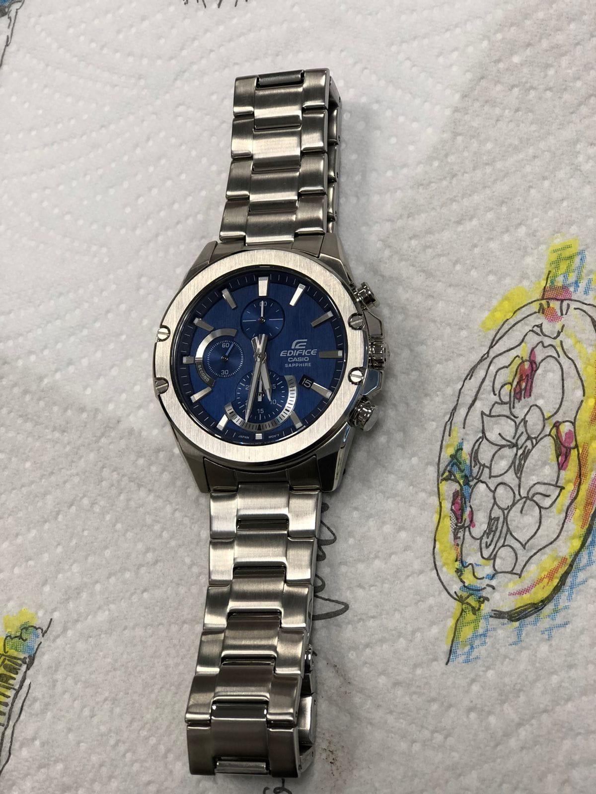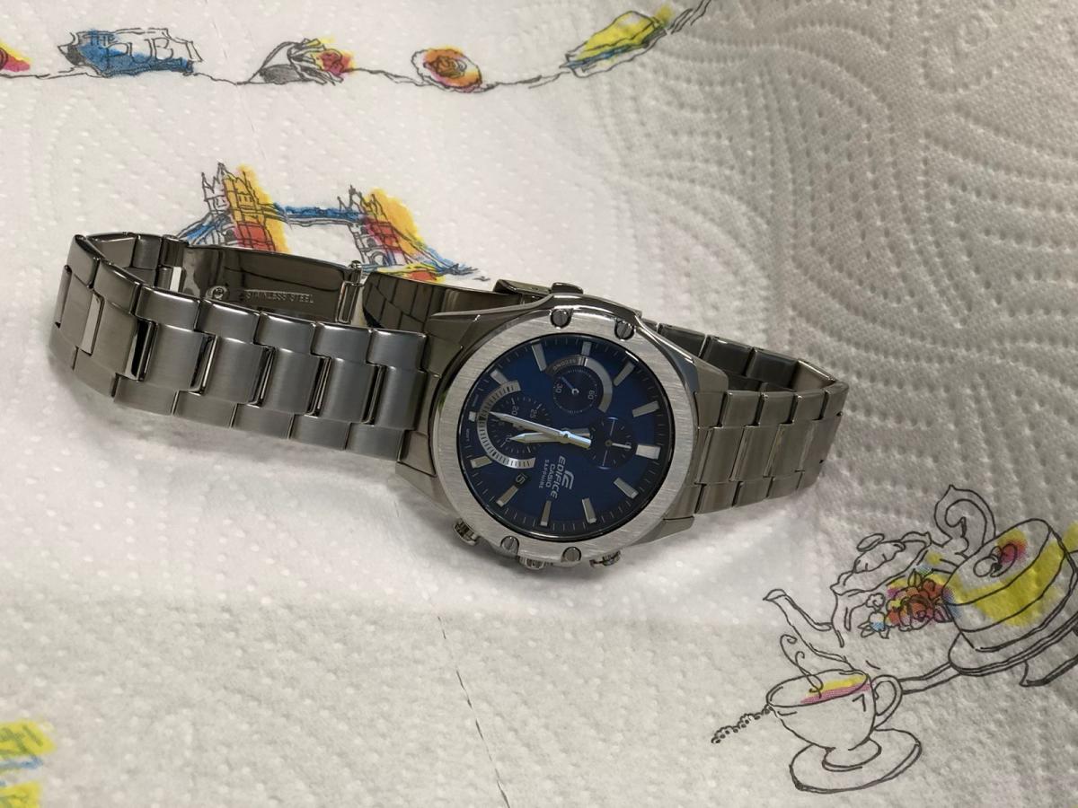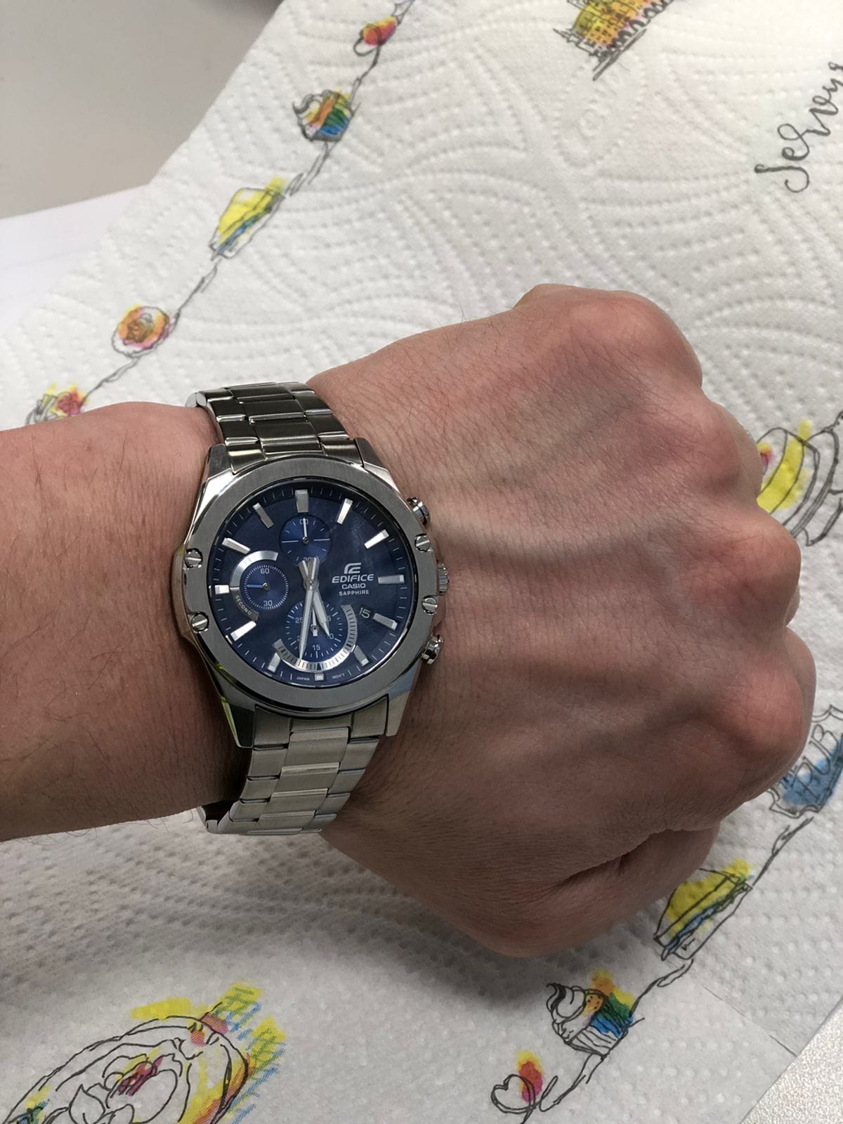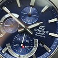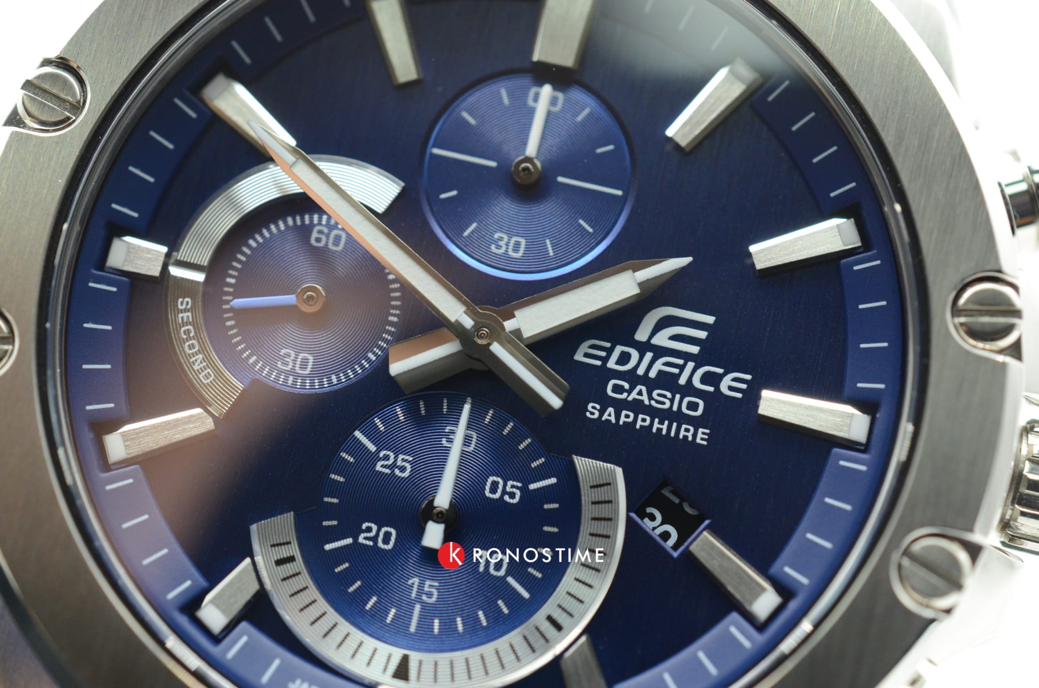 Мужские часы-хронографХронографФункция позволяет измерять отрезки времени с особой точностью: часы, минуты, секунды. Верным признаком хронографа является наличие на циферблате 3 дополнительных окошек-счётчиков. Casio Edifice EFR-S567D-2A, кварцевый механизм с высокой точностью. Минеральное стеклоМинеральное стеклоМинеральное стекло представляет собой искусственно выращенный минерал кварца. Такое стекло отличается особой устойчивостью к повреждениям и царапинам. Уступает по некоторым качествам сапфировому стеклу. устойчивое к появлению царапин, обладающее высокой прозрачностью. СекундомерСекундомерСекундоме́р — прибор, способный измерять интервалы времени с точностью до долей секунды. с точностью показаний 1/10с и временем измерения 1ч. Корпус изготовлен из нержавеющей стали. Стрелки и метки с люминесцентным покрытиемЛюминесцентное покрытиеПозволяет считывать показания времени в темноте. Производители наносят на стрелки, часовые индексы, безель или поверхность циферблата светонакопительный состав, дающий холодное свечение.. На циферблате находится три дополнительных индикатора. Окошко даты находится в положении 3 часов. Класс водозащиты: 100 метров, позволит плавать, нырять и заниматься другими водными видами спорта. Заводная головка с защитой. Стальной браслет на раскладной застёжкеРаскладная застёжкаТакой тип застёжки используется только на браслетах из металла. Она никогда не раскрывается полностью, происходит разделение на 2 и более частей. Раскладывающая застёжка снизит вероятность потери часов к минимуму..