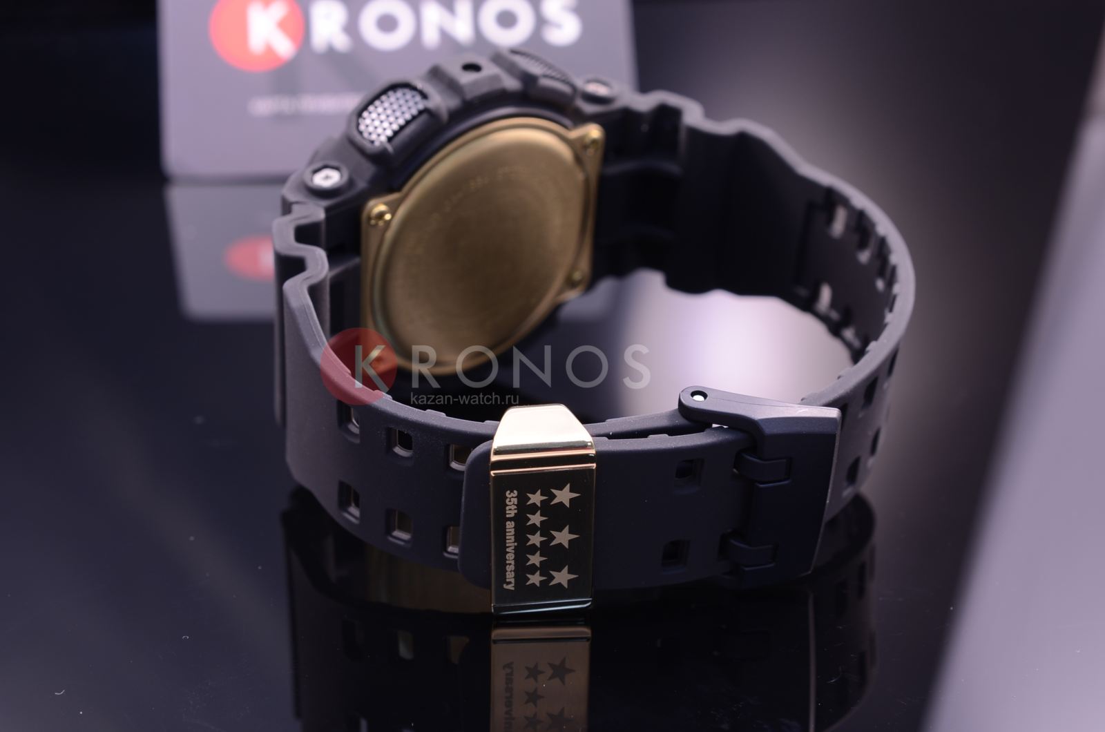Лимитированная серия. Задняя крышка всех часов в коллекции украшена гравировкой с логотипом 35-й годовщины G-SHOCK, разработанным известным художником-графиком Эриком Хейзем (Eric Haze). На застежке размещена звездная эмблема, символизирующая цифру 35. Для каждых часов была подготовлена коллекционная коробка. Противоударный корпус защищает механизм от ударов и вибрации. Защищены от магнитных полей. Циферблат подсвечивается светодиодом, функция автоподсветки освещает циферблат при повороте часов к лицу. Мировое время – 48 городов (29 часовых поясов), всемирное координированное время (UTC). Автоматический переход на зимнее и летнее время, возможность включения/отключения данной функции. 12-ти и 24-х часовой формат времени. Секундомер с точностью показаний 1/1000с и временем измерения 100ч. Измерение скорости. Сплит-хронограф. Таймер обратного отсчета от 1мин до 24ч с автоповтором.