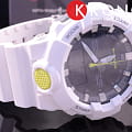 Белая модель с жёлтыми деталями точно станет запоминающейся деталью вашего образа. Часы получили обновлённый дизайн и уменьшенный противоударный корпусУдаропрочный корпусМеханизм заключён в корпус, выполненный из современных материалов, устойчивых к ударам, механическим повреждениям и падению с высоты: инновационный пластик, карбон, нержавеющая сталь, титан., если сравнивать с моделями серии GA-700. Он выполнен из полимерного пластика, что гарантирует повышенную устойчивость к ударам, повреждениям, падению с высоты. Японский кварцевый калибр с точностью хода +/- 15 секунд в месяц. Срок службы батарейки - 3 года. Функция выключения и включения звука кнопок. Стрелки с люминесцентным покрытиемЛюминесцентное покрытиеПозволяет считывать показания времени в темноте. Производители наносят на стрелки, часовые индексы, безель или поверхность циферблата светонакопительный состав, дающий холодное свечение.. Двойная светодиодная подсветкаСветодиодная подсветкаСветодиодная или LED-подсветка обеспечивает появление яркого холодного свечения за счёт LED-элементов - маленьких лампочек. Они потребляют минимальное количество энергии, чаще всего можно встретить 1 светодиод, в нижней части циферблата.. Водозащита 20 бар. Минеральное стекло. Полимерный браслет. Секундомер, таймер обратного отсчёта, мировое времяМировое время Полезное часовое усложнение, отображающее время в основных городах и известных областях по всему миру, оно связано с часовыми поясами, удобно для путешественников и бизнесменов. , 5 ежедневных будильников, автоматический календарь. Габариты: 54,1 x 48,6 x 15,5 мм.