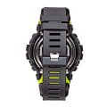 Наручные часы с ярко-зелёными деталями идеально смотрятся на запястье, они станут грамотным дополнением к повседневному или спортивному стилю одежды. Они оснащены высокоточным шагомером с измерением количества шагов от 0 до 999999, в мобильном приложении G-Shock Connected Phone можно хранить данные физической активности и устанавливать ежедневную норму, это позволяет осуществить технология BluetoothBluetoothСовременная технология, позволяющая синхронизировать часы с телефоном и переносить данные. Часы с Bluetooth расширяют возможности вашего смартфона и делают его использование ещё более удобным.. Японский кварцевый калибр. Эксплуатационный срок батарейки составляет 3 года. Надёжный противоударный корпусУдаропрочный корпусМеханизм заключён в корпус, выполненный из современных материалов, устойчивых к ударам, механическим повреждениям и падению с высоты: инновационный пластик, карбон, нержавеющая сталь, титан. из полимерного пластика тёмно-серого цвета. Минеральное стекло устойчиво к царапинам. Двойная подсветка: стрелки с люминесцентным покрытиемЛюминесцентное покрытиеПозволяет считывать показания времени в темноте. Производители наносят на стрелки, часовые индексы, безель или поверхность циферблата светонакопительный состав, дающий холодное свечение., циферблат подсвечивается светодиодомСветодиодная подсветкаСветодиодная или LED-подсветка обеспечивает появление яркого холодного свечения за счёт LED-элементов - маленьких лампочек. Они потребляют минимальное количество энергии, чаще всего можно встретить 1 светодиод, в нижней части циферблата.. Водостойкость до 20 бар. Мировое времяМировое время Полезное часовое усложнение, отображающее время в основных городах и известных областях по всему миру, оно связано с часовыми поясами, удобно для путешественников и бизнесменов. , таймер, автоматический календарь до 2099 года, будильник, хронографХронографФункция позволяет измерять отрезки времени с особой точностью: часы, минуты, секунды. Верным признаком хронографа является наличие на циферблате 3 дополнительных окошек-счётчиков., секундомер. Габариты: 54,1 x 48,6 x 15,5 мм.