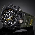 Японские мужские часы из коллекции G-Shock помогут завершить повседневный образ и порадуют владельца широким функционалом. Наручные часы серии Mudmaster привлекают брутальным дизайном с внушительным ударопрочным корпусомУдаропрочный корпусМеханизм заключён в корпус, выполненный из современных материалов, устойчивых к ударам, механическим повреждениям и падению с высоты: инновационный пластик, карбон, нержавеющая сталь, титан.. Они выполнены в стиле милитари, сочетая в себе узнаваемое оформление, прочные материалы и современные технологии. Привлекательно смотрится полимерный ремешок цвета хаки, обеспечивающий комфортное ношение. Циферблат защищает сапфировое стеклоСапфировое стеклоПрочный и надёжный материал из кристалла сапфира синтетического происхождения, характеризующийся особой твёрдостью и устойчивостью к царапинам и повреждениям. с антибликовым покрытием, устойчивое к возникновению царапин на поверхности. Корпус из высококачественного пластика. Двойная электролюминесцентная подсветкаЭлектролюминесцентная подсветкаЭлектролюминесцентная панель устанавливается под ЖК-экраном часов, при нажатии кнопки электричество преобразуется в свет за счёт подачи напряжения на атомы фосфора, такой тип подсветки позволяет освещать весь циферблат.. Питание от солнечной батареи Tough SolarTough SolarТехнология основана на подзарядке аккумулятора от источника солнечного света, специальная панель улавливает солнечные лучи и преобразует их в энергию для работы часов. Достаточно пары минут нахождения на солнце для функционирования часов в течении суток.. Индикатор заряда батарейки. Устойчивость к грязи и пыли. Включение и выключение звука кнопок. Функции: цифровой компас, барометр, термометр от -10° С до +60°С, UTCUTCВсемирное кординационное время, не имеющее привязки к географическому положению Гринвича, основывается на атомном отсчёте времени. Регулировка времени осуществляется более точно, чем устаревшее GMT.