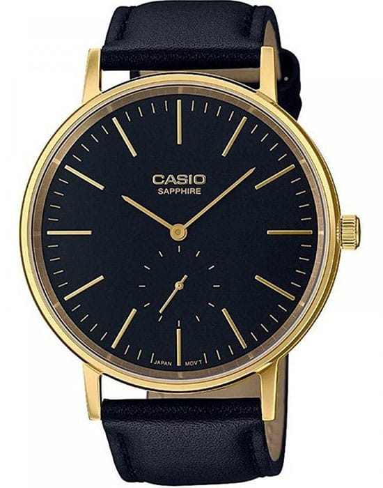Удобные, стильные наручные часы от Casio являются воплощением практичности и элегантного дизайна. Круглый, золотой корпус выполнен из нержавеющей стали. Стильный черный ремень сделан из натуральной кожи. Сохранность часов обеспечивается прочным сапфировым стеклом. Временные отметки представлены в виде золотистых штрихов. Миниатюрная секундная стрелка вынесена на отдельный циферблат. Тип механизма - кварцевый. Вес аксессуара равен 40 граммам.