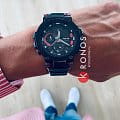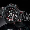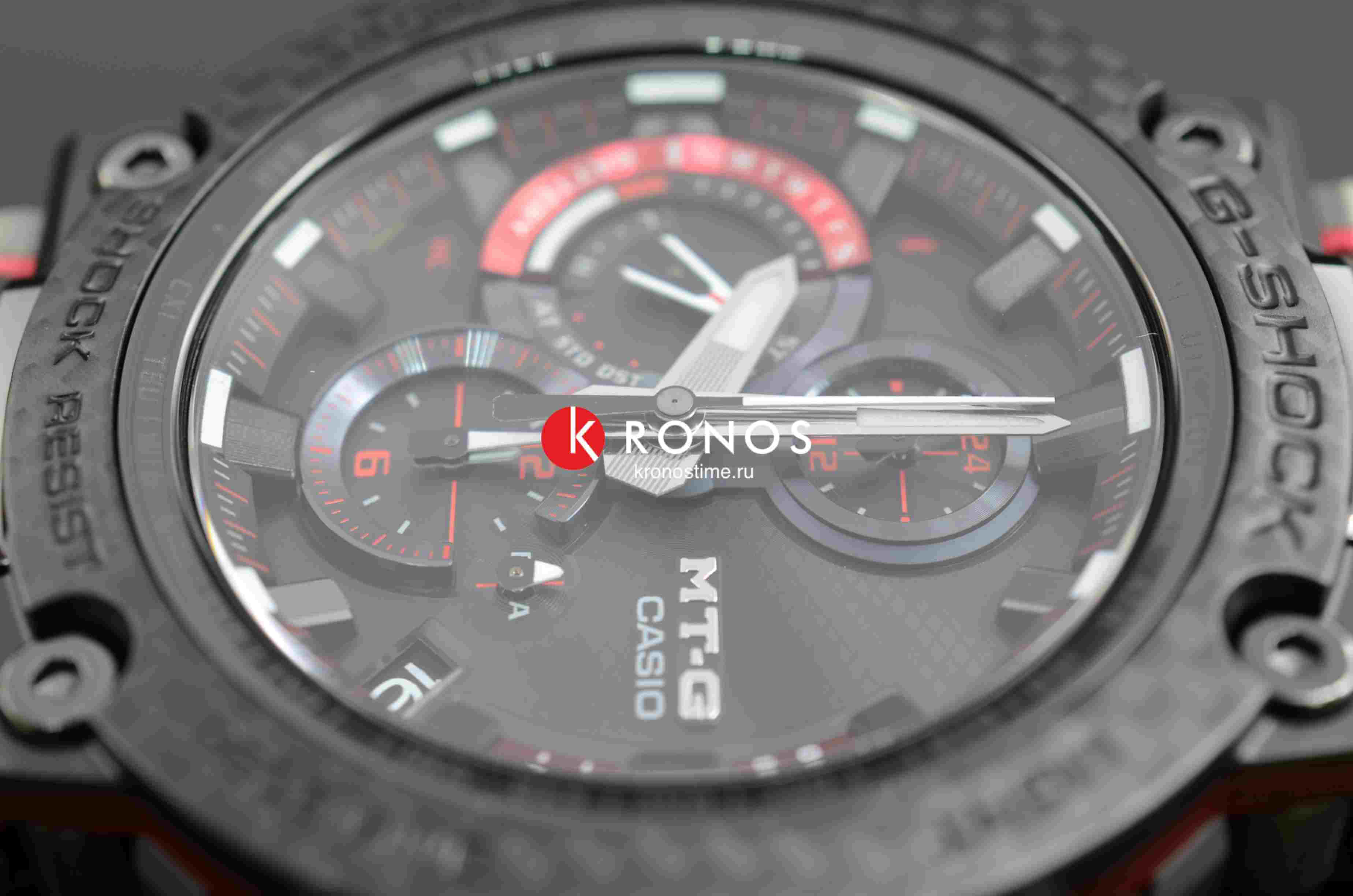 Чёрный циферблат с красными акцентами отличается необычной ромбовидной текстурой, внушительный карбоновый безель имеет шахматный узор. Casio обновили ударопрочный корпусУдаропрочный корпусМеханизм заключён в корпус, выполненный из современных материалов, устойчивых к ударам, механическим повреждениям и падению с высоты: инновационный пластик, карбон, нержавеющая сталь, титан., по сравнению с предыдущими моделями MTG он получился компактнее и тоньше (14,4 мм). Корпус выполнен из нержавеющей стали и пластика, усиленного карбоном - Carbon Core GuardCarbon Core Guard Новейшая структура корпуса, разработанная Casio. Полиуретановая пластина дополнительно усилена карбоновыми вставками, что придаёт специальную защиту от механических повреждений. Карбон отличается лёгкостью и прочностью.. Дополнительно внедрили вставки из материала alphaGEL, силиконовая прослойка обеспечивает возникновение амортизирующего эффекта. Чёрное IP-покрытиеIP-покрытиеМетод ионного напыления. Демонстрирует повышенную устойчивость к истиранию, окислению и химическим веществам. Под воздействием высокого давления и температуры около 1500°C молекулы металла надёжно соединяются с частицами корпуса часов.. Технология . Подсветка экрана. Стекло из сапфира. Функции: Bluetooth SmartBluetoothСовременная технология, позволяющая синхронизировать часы с телефоном и переносить данные. Часы с Bluetooth расширяют возможности вашего смартфона и делают его использование ещё более удобным., поиск телефона, будильник, приём радиосигнала, хронографХронографФункция позволяет измерять отрезки времени с особой точностью: часы, минуты, секунды. Верным признаком хронографа является наличие на циферблате 3 дополнительных окошек-счётчиков., календарь, мировое времяМировое время Полезное часовое усложнение, отображающее время в основных городах и известных областях по всему миру, оно связано с часовыми поясами, удобно для путешественников и бизнесменов. . Габариты: 51,7 x 55,8 x 14,4 мм.