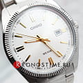 Японские мужские часы из коллекции MTP Collection воплощают собой классику в современном исполнении, минималистичное оформление позволяет носить часы в качестве дополнения к повседневному, деловому, повседневному образу. Лаконичный белый циферблат с серебристыми стрелками и метками никогда не утратит актуальности. Элегантности добавляет фактурный безельБезельВнешний ободок, закрепляющий стекло. В спортивных часах так называется поворотное кольцо с делениями на циферблате, выполняет роль таймера – замеряет отрезки времени на шкале. Неподвижный безель – элемент декора. Однонаправленно вращающийся безель на дайверских часах позволяет фиксировать моменты погружения и выныривания на поверхность.. Браслет сделан из нержавеющей стали 316L, отличающейся устойчивостью к царапинам и износу, для корпуса была выбрана гипоаллергенная латунь. Кварцевый механизм с высокой точностью хода. Водостойкость 50 метров. Стрелки с люминесцентным покрытиемЛюминесцентное покрытиеПозволяет считывать показания времени в темноте. Производители наносят на стрелки, часовые индексы, безель или поверхность циферблата светонакопительный состав, дающий холодное свечение.. Минеральное стекло. Апертура даты. Габариты: 44,2 x 38,5 x 9,2 мм.