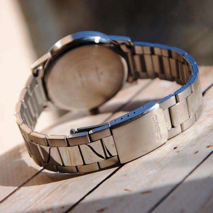 Японские мужские часы с минеральным стекломМинеральное стеклоМинеральное стекло представляет собой искусственно выращенный минерал кварца. Такое стекло отличается особой устойчивостью к повреждениям и царапинам. Уступает по некоторым качествам сапфировому стеклу. Casio Collection MTP-1303PD-1A из коллекции Casio MTP представляет собой максимально комфортный и стильный аксессуар на все случаи жизни. Кварцевый механизм с высокой точностью. Наручные часы от Casio выдержаны в повседневном стиле. Стильный и практичный дизайн завоюет сердца тех, кто предпочитает привлекательность и удобство. Прочный корпус выполнен из гипоаллергенной латуни. На циферблате традиционной формы расположены четкие временные отметки и изящные стрелки. Подсветка NeobriteПодсветка NeobriteИспользование светонакопительных составов на основе сульфида цинка или алюмината стронция, яркий свет можно наблюдать на протяжении 6-10 часов после «зарядки» часов около источника света. обеспечивает длительное послесвечение в темноте даже после кратковременного нахождения на свету. Класс водозащиты: 50 метров, позволит защитить корпус от случайных брызг или капель дождя. Стальной браслет на раскладной застёжкеРаскладная застёжкаТакой тип застёжки используется только на браслетах из металла. Она никогда не раскрывается полностью, происходит разделение на 2 и более частей. Раскладывающая застёжка снизит вероятность потери часов к минимуму..