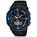 Многофункциональные часы круглой формы с аналогово-цифровым циферблатом черного цвета, обрамленным алюминиевым безелем цвета ночного неба. Черно-синий пластиковый корпус удерживается на руке черным пластиковым браслетом. Часы Casio SGW-500H-2B имеют светодиодную подсветку, встроенный цифровой компас, отображение возраста и фазы Луны, времени восхода и захода солнца, температурным датчиком, 5 будильниками и автоматическим календарем, указывающим число, день недели, месяц и год. Корпус - Алюминий; Стекло - Пластик; Водозащита - 100 м. (WR 100); Материал ремешка - Пластиковый; Цвет ремешка - Черный; Цвет циферблата - Черный.