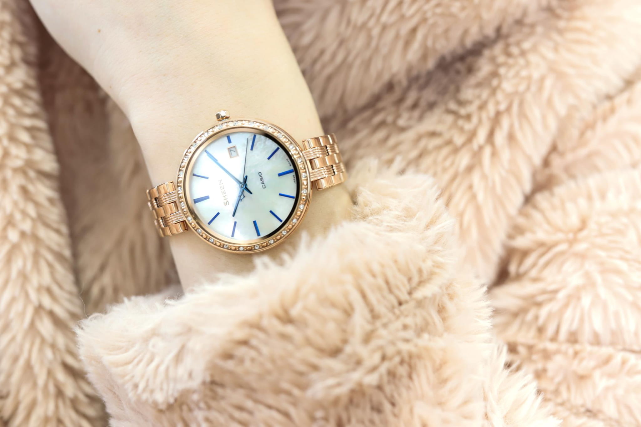 Дизайнеры декорировали безельБезельВнешний ободок, закрепляющий стекло. В спортивных часах так называется поворотное кольцо с делениями на циферблате, выполняет роль таймера – замеряет отрезки времени на шкале. Неподвижный безель – элемент декора. Однонаправленно вращающийся безель на дайверских часах позволяет фиксировать моменты погружения и выныривания на поверхность. модели сияющими кристаллами Swarovski, привлекательно смотрится перламутровый циферблат. Японский кварцевый механизм защищён стальным корпусом с IP-покрытиемIP-покрытиеМетод ионного напыления. Демонстрирует повышенную устойчивость к истиранию, окислению и химическим веществам. Под воздействием высокого давления и температуры около 1500°C молекулы металла надёжно соединяются с частицами корпуса часов. цвета розового золота. На метке 3 часов размещена апертура даты. Сохраняется водостойкость при давлении до 5 бар.