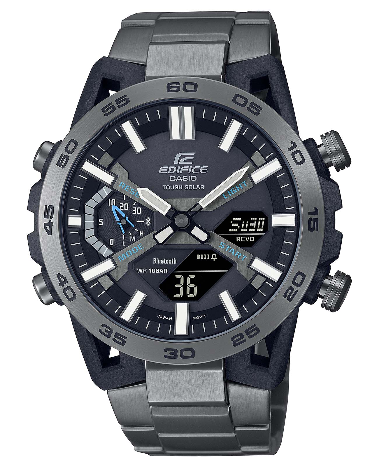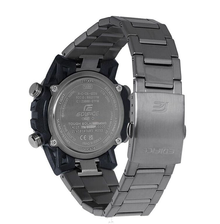 Многофункциональные японские мужские часы Casio Edifice ECB-2000DС-1A.Супер стильный релиз в коллекции Edifice из топовой аналого-цифровой серии ECB-2000. Среди функций питание от солнечной энергии Tough SolarTough SolarТехнология основана на подзарядке аккумулятора от источника солнечного света, специальная панель улавливает солнечные лучи и преобразует их в энергию для работы часов. Достаточно пары минут нахождения на солнце для функционирования часов в течении суток., автоматическое сохранение энергии. Время работы аккумулятора без подзарядки приблизительно 7 месяцев, при включенной функции сохранения энергии приблизительно 18 месяцев. Двойная светодиодная подсветка Super Illuminator с функцией Afterglow. Цвет подсветки: белый. 12-ти и 24-х часовой формат времени. Секундомер с двумя точностями показаний: 1/100с (до 1ч) и 1с (после 1ч) и временем измерения 24ч. SPLIT-хронографСплит-хронографИспользуется для измерения продолжительности нескольких временных отрезков, начинающихся одновременно, а заканчивающихся в разное время.. Таймер обратного отсчета от 1с до 24ч. Мировое времяМировое время Полезное часовое усложнение, отображающее время в основных городах и известных областях по всему миру, оно связано с часовыми поясами, удобно для путешественников и бизнесменов. – 38 часовых поясов, всемирное координированное время (UTCUTCВсемирное кординационное время, не имеющее привязки к географическому положению Гринвича, основывается на атомном отсчёте времени. Регулировка времени осуществляется более точно, чем устаревшее GMT.