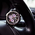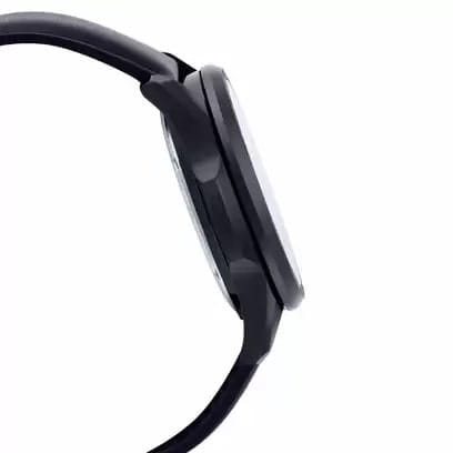 Ремешок выполнен из натуральной кожи чёрного цвета, обеспечивая комфорт при носке. Модель обладает водонепроницаемостью до 100 метров, что делает её подходящей для плавания и сноркелинга.