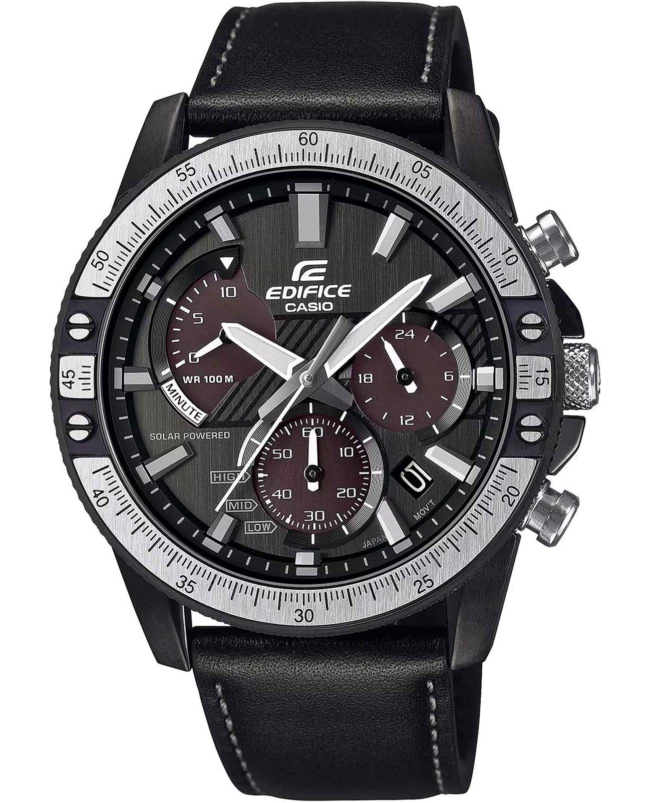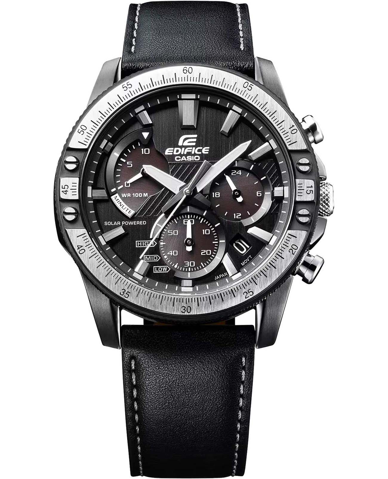 Японские мужские часы Casio Edifice EQS-930TL-1AVUDF. Питание от солнечной энергии Tough SolarTough SolarТехнология основана на подзарядке аккумулятора от источника солнечного света, специальная панель улавливает солнечные лучи и преобразует их в энергию для работы часов. Достаточно пары минут нахождения на солнце для функционирования часов в течении суток., индикатор заряда батареи. Время работы аккумулятора без подзарядки приблизительно 5 месяцев. Часы-хронографХронографФункция позволяет измерять отрезки времени с особой точностью: часы, минуты, секунды. Верным признаком хронографа является наличие на циферблате 3 дополнительных окошек-счётчиков. с секундомеромСекундомерСекундоме́р — прибор, способный измерять интервалы времени с точностью до долей секунды. с точностью показаний 1с и временем измерения 10мин. 12-ти и 24-х часовой формат времени. Метки в виде штрихов. Окошко даты находится между метками 4 и 5 часов. Кожаный ремешок на стандартной застежке. Подсветка NeobriteПодсветка NeobriteИспользование светонакопительных составов на основе сульфида цинка или алюмината стронция, яркий свет можно наблюдать на протяжении 6-10 часов после «зарядки» часов около источника света..