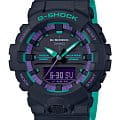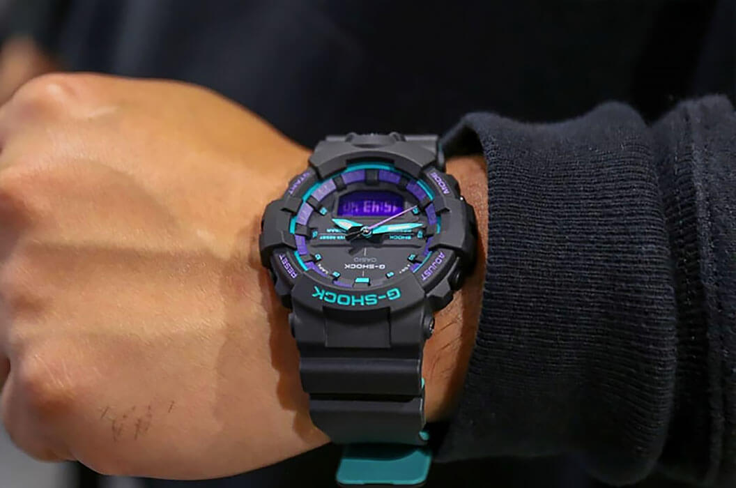 Основным цветом стал чёрный, на тёмном фоне отлично смотрятся фиолетовые и бирюзовые детали. При создании модели дизайнеры вдохновлялись атмосферой ночных клубов, где часто проводят время молодые люди. Аксессуар имеет уменьшенный противоударный корпусУдаропрочный корпусМеханизм заключён в корпус, выполненный из современных материалов, устойчивых к ударам, механическим повреждениям и падению с высоты: инновационный пластик, карбон, нержавеющая сталь, титан., если сравнивать с представителями серии GA-700, устойчивый к ударам и вибрации. Он надёжно защищает японский кварцевый механизм с точностью хода -/+ 15 секунд в месяц. Батарейка характеризуется 3-летним сроком службы. Прочное минеральное стекло. Автоматическая светодиодная подсветкаСветодиодная подсветкаСветодиодная или LED-подсветка обеспечивает появление яркого холодного свечения за счёт LED-элементов - маленьких лампочек. Они потребляют минимальное количество энергии, чаще всего можно встретить 1 светодиод, в нижней части циферблата., стрелки с люминесцентным покрытиемЛюминесцентное покрытиеПозволяет считывать показания времени в темноте. Производители наносят на стрелки, часовые индексы, безель или поверхность циферблата светонакопительный состав, дающий холодное свечение.. Минеральное стекло. Водозащита до 200 метров. Браслет из полимерного материала. Функция перемещения стрелок для лёгкого доступа к показаниям с цифровых мини-дисплеев. ХронографХронографФункция позволяет измерять отрезки времени с особой точностью: часы, минуты, секунды. Верным признаком хронографа является наличие на циферблате 3 дополнительных окошек-счётчиков., таймер обратного отсчёта, мировое времяМировое время Полезное часовое усложнение, отображающее время в основных городах и известных областях по всему миру, оно связано с часовыми поясами, удобно для путешественников и бизнесменов. , будильник, UTCUTCВсемирное кординационное время, не имеющее привязки к географическому положению Гринвича, основывается на атомном отсчёте времени. Регулировка времени осуществляется более точно, чем устаревшее GMT.
