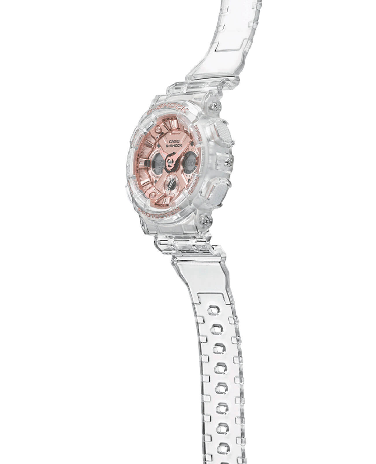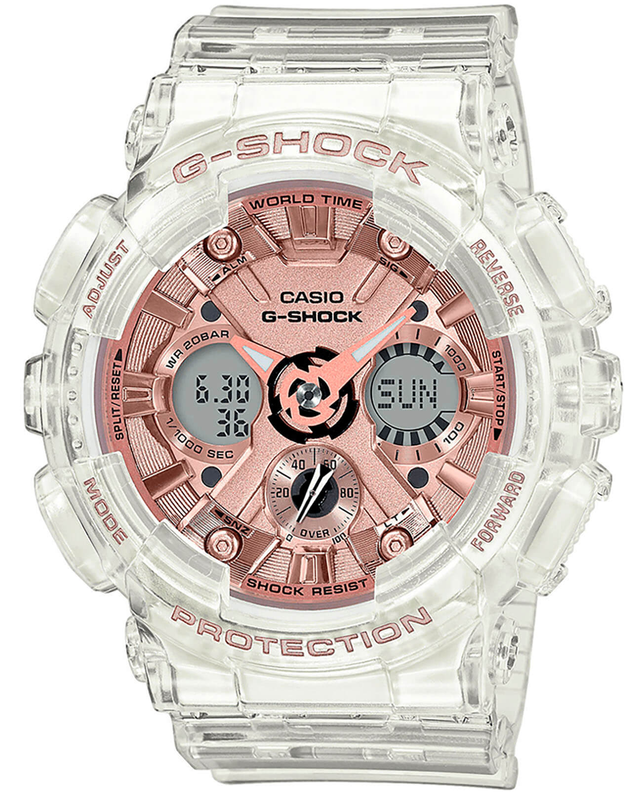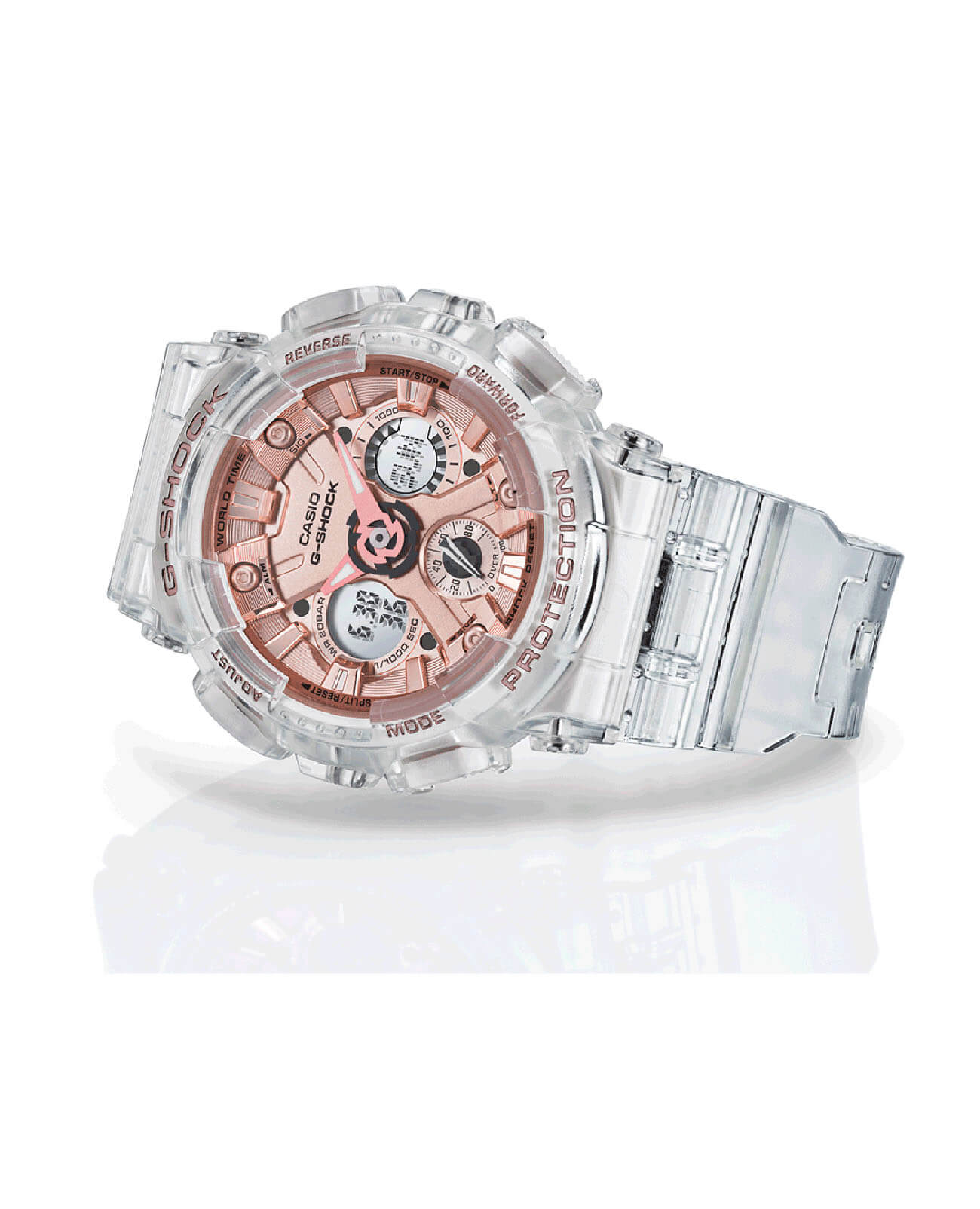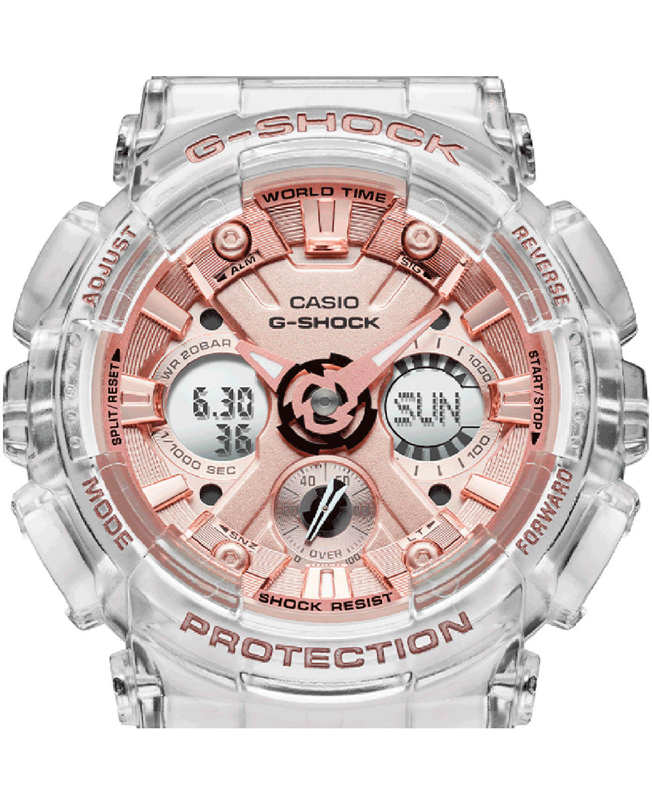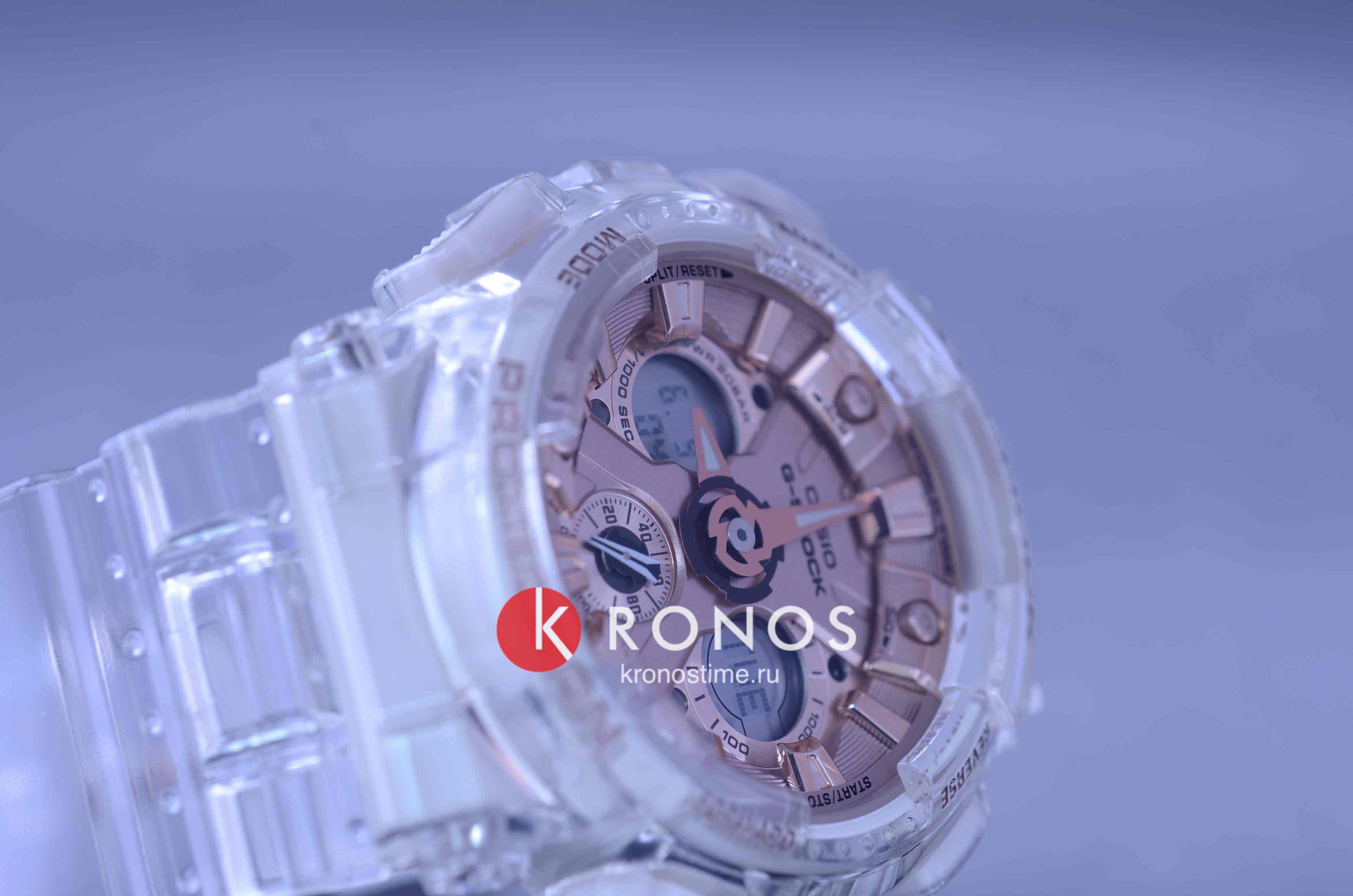 Наручные часы представлены в линейке G-Shock Women Skeleton, выполненной на базе моделей G-Shock GMA-110/120. Они напоминают о механических часах скелетонах, демонстрируя полупрозрачный пластиковый корпус и ремешок. Цветовым акцентом стал переливающийся циферблат оттенка розового золота, который придётся по душе любой моднице. Аксессуар характеризуется лёгким весом и комфортно сидит на запястье, выдерживая нагрузки, вибрации, воздействие магнитных полей. Японский кварцевый механизм позволяет измерять время с высокой точностью хода. Калибр работает за счёт батарейки, рассчитанной на 3 года службы. Используется закаленное минеральное стекло, препятствующее возникновению царапин. Яркая светодиодная подсветкаСветодиодная подсветкаСветодиодная или LED-подсветка обеспечивает появление яркого холодного свечения за счёт LED-элементов - маленьких лампочек. Они потребляют минимальное количество энергии, чаще всего можно встретить 1 светодиод, в нижней части циферблата. освещает циферблат, позволяя использовать часы в темноте. Функции помогают справляться с ежедневными делами: хронографХронографФункция позволяет измерять отрезки времени с особой точностью: часы, минуты, секунды. Верным признаком хронографа является наличие на циферблате 3 дополнительных окошек-счётчиков., таймер, вечный календарьВечный календарьКлассическое часовое усложнение, представляющее собой календарь, рассчитанный на несколько лет вперёд (стандартно – до 2099 года). Определяет текущую дату, день недели, месяц., секундомер, мировое времяМировое время Полезное часовое усложнение, отображающее время в основных городах и известных областях по всему миру, оно связано с часовыми поясами, удобно для путешественников и бизнесменов. , будильник, UTCUTCВсемирное кординационное время, не имеющее привязки к географическому положению Гринвича, основывается на атомном отсчёте времени. Регулировка времени осуществляется более точно, чем устаревшее GMT.